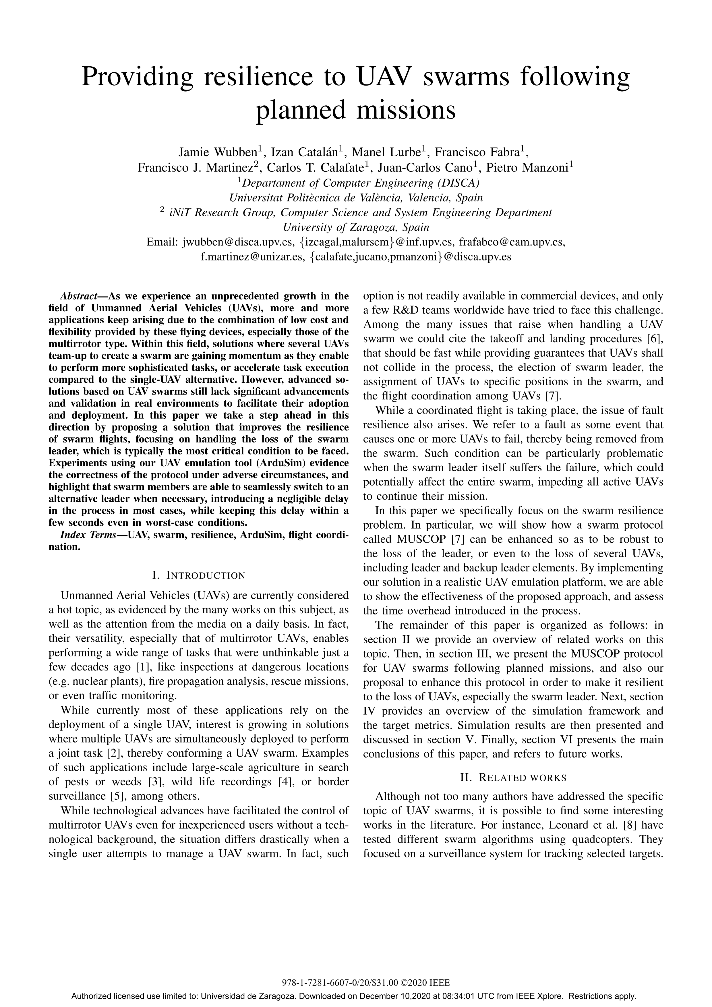 Resumen: As we experience an unprecedented growth in the field of Unmanned Aerial Vehicles (UAVs), more and more applications keep arising due to the combination of low cost and flexibility provided by these flying devices, especially those of the multirrotor type. Within this field, solutions where several UAVs team-up to create a swarm are gaining momentum as they enable to perform more sophisticated tasks, or accelerate task execution compared to the single-UAV alternative. However, advanced solutions based on UAV swarms still lack significant advancements and validation in real environments to facilitate their adoption and deployment. In this paper we take a step ahead in this direction by proposing a solution that improves the resilience of swarm flights, focusing on handling the loss of the swarm leader, which is typically the most critical condition to be faced. Experiments using our UAV emulation tool (ArduSim) evidence the correctness of the protocol under adverse circumstances, and highlight that swarm members are able to seamlessly switch to an alternative leader when necessary, introducing a negligible delay in the process in most cases, while keeping this delay within a few seconds even in worst-case conditions. Idioma: Inglés DOI: 10.1109/ICCCN49398.2020.9209634 Año: 2020 Publicado en: Proceedings - International Conference on Computer Communications and Networks, ICCCN 2020-August (2020), [6 pp] ISSN: 1095-2055 Factor impacto SCIMAGO: 0.275 - Computer Networks and Communications - Software - Hardware and Architecture - Computer Science (miscellaneous)