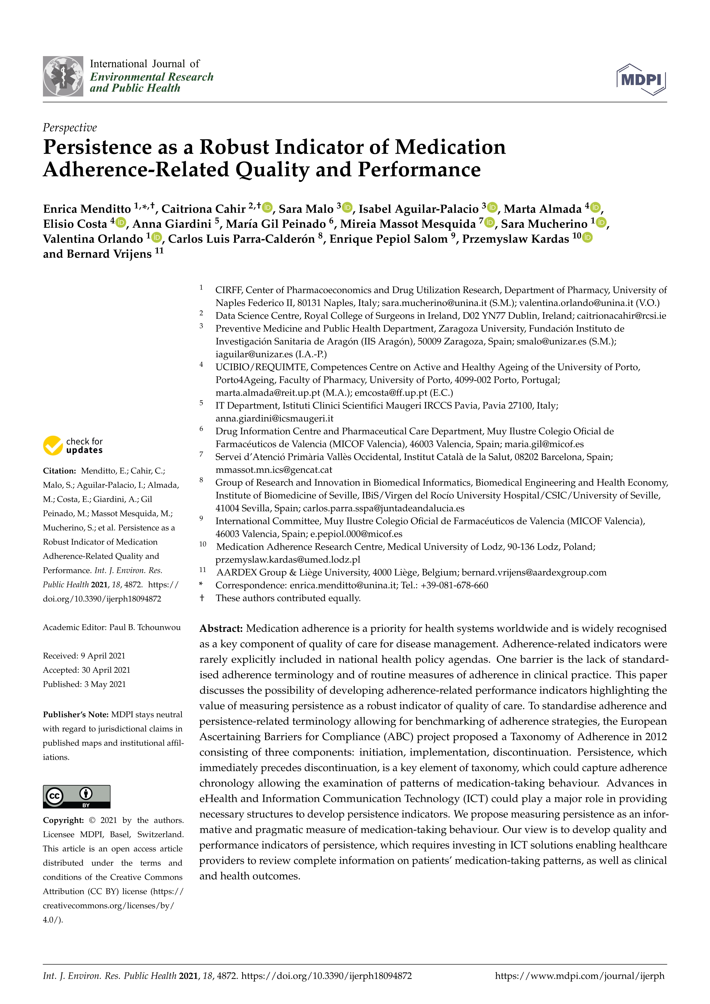 Resumen: Medication adherence is a priority for health systems worldwide and is widely recognised as a key component of quality of care for disease management. Adherence-related indicators were rarely explicitly included in national health policy agendas. One barrier is the lack of standardised adherence terminology and of routine measures of adherence in clinical practice. This paper discusses the possibility of developing adherence-related performance indicators highlighting the value of measuring persistence as a robust indicator of quality of care. To standardise adherence and persistence-related terminology allowing for benchmarking of adherence strategies, the European Ascertaining Barriers for Compliance (ABC) project proposed a Taxonomy of Adherence in 2012 consisting of three components: initiation, implementation, discontinuation. Persistence, which immediately precedes discontinuation, is a key element of taxonomy, which could capture adherence chronology allowing the examination of patterns of medication-taking behaviour. Advances in eHealth and Information Communication Technology (ICT) could play a major role in providing necessary structures to develop persistence indicators. We propose measuring persistence as an informative and pragmatic measure of medication-taking behaviour. Our view is to develop quality and performance indicators of persistence, which requires investing in ICT solutions enabling healthcare providers to review complete information on patients’ medication-taking patterns, as well as clinical and health outcomes. Idioma: Inglés DOI: 10.3390/ijerph18094872 Año: 2021 Publicado en: International journal of environmental research and public health 18, 9 (2021), 4872 [9 pp.] ISSN: 1661-7827 Factor impacto JCR: 4.614 (2021) Categ. JCR: PUBLIC, ENVIRONMENTAL & OCCUPATIONAL HEALTH rank: 45 / 183 = 0.246 (2021) - Q1 - T1 Categ. JCR: PUBLIC, ENVIRONMENTAL & OCCUPATIONAL HEALTH rank: 71 / 210 = 0.338 (2021) - Q2 - T2 Categ. JCR: ENVIRONMENTAL SCIENCES rank: 100 / 279 = 0.358 (2021) - Q2 - T2 Factor impacto CITESCORE: 4.5 - Medicine (Q2) - Environmental Science (Q2)