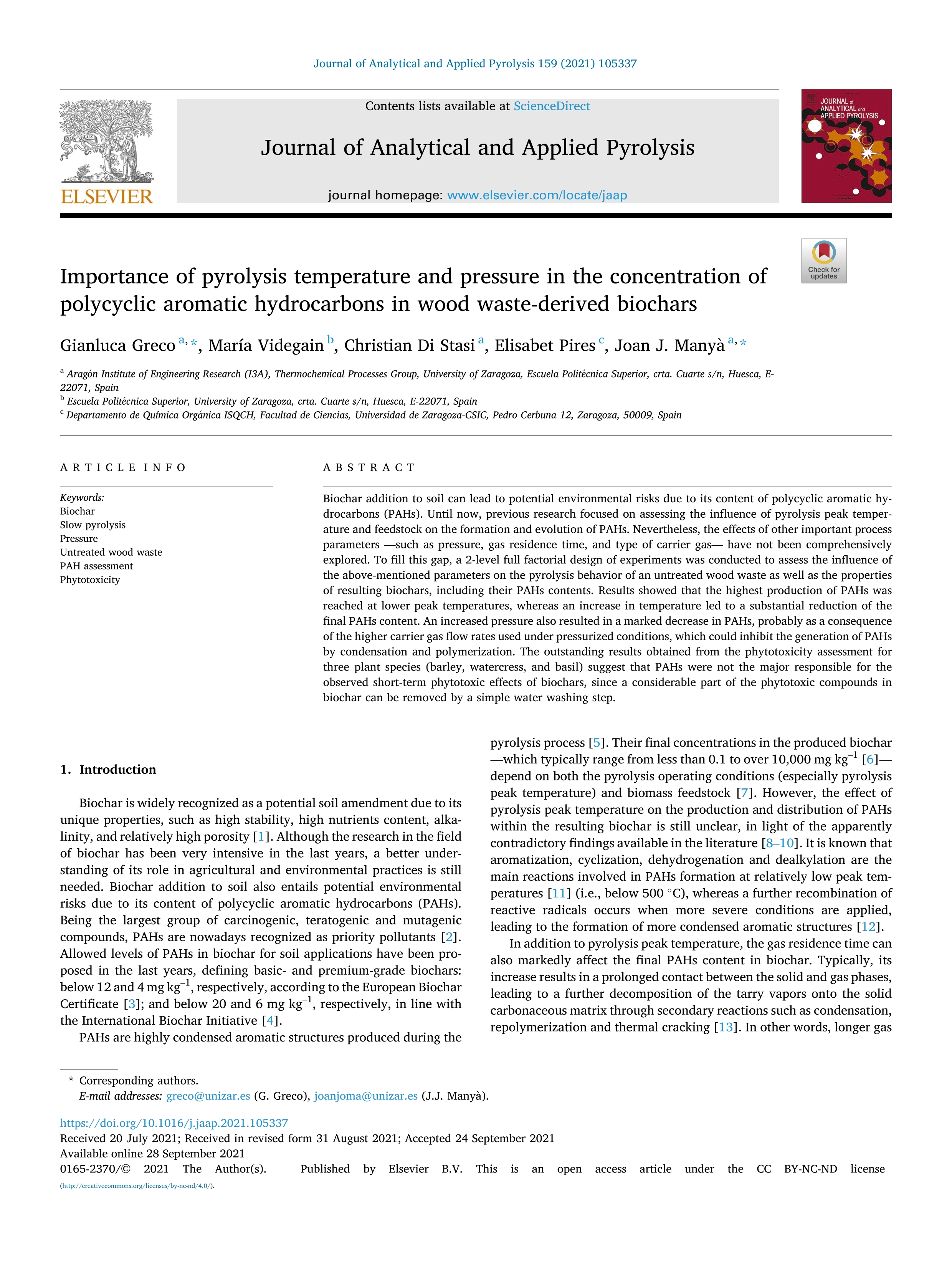 | Página principal > Artículos > Importance of pyrolysis temperature and pressure in the concentration of polycyclic aromatic hydrocarbons in wood waste-derived biochars |