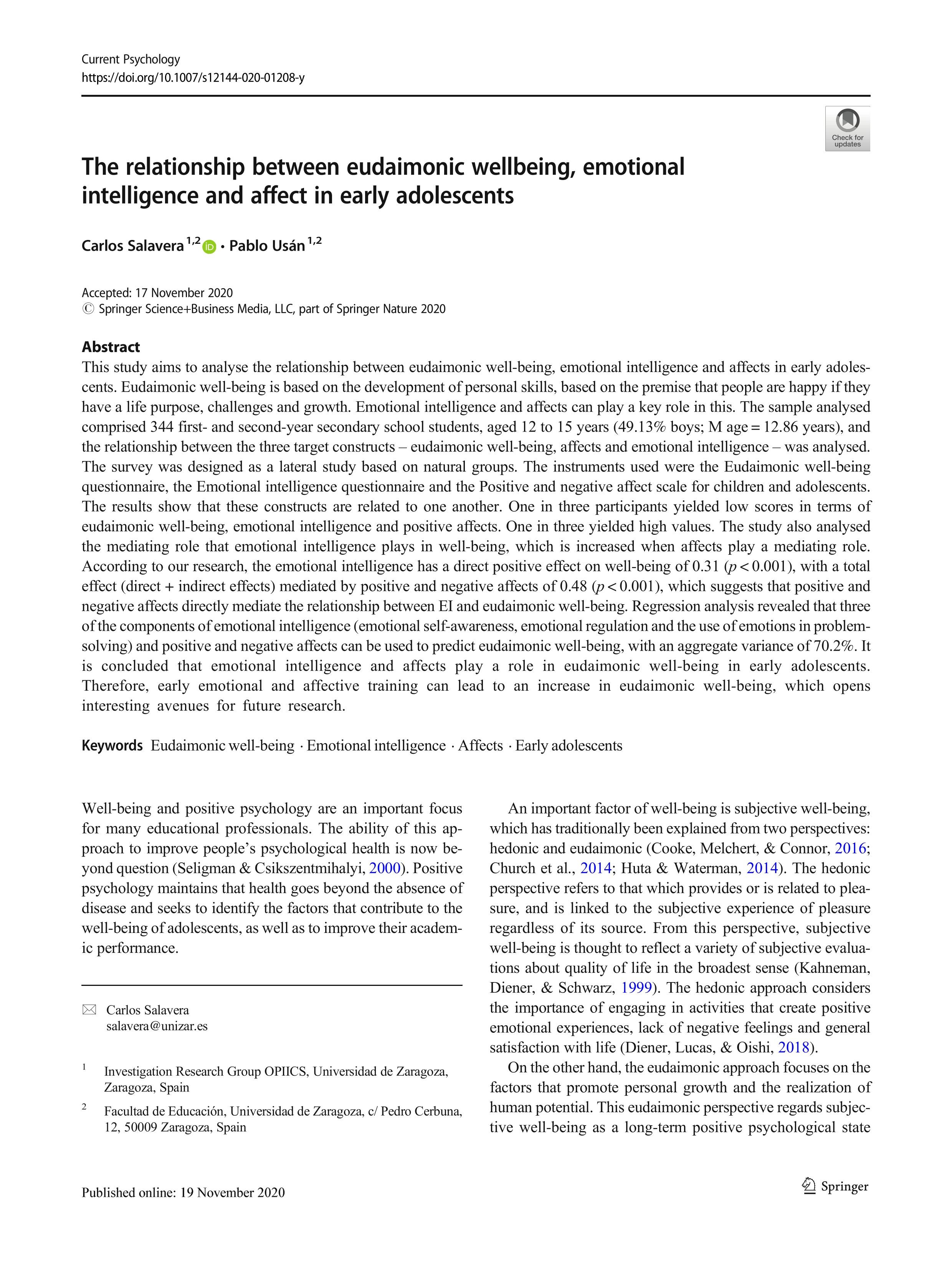 Resumen: This study aims to analyse the relationship between eudaimonic well-being, emotional intelligence and affects in early adolescents. Eudaimonic well-being is based on the development of personal skills, based on the premise that people are happy if they have a life purpose, challenges and growth. Emotional intelligence and affects can play a key role in this. The sample analysed comprised 344 first- and second-year secondary school students, aged 12 to 15 years (49.13% boys; M age = 12.86 years), and the relationship between the three target constructs – eudaimonic well-being, affects and emotional intelligence – was analysed. The survey was designed as a lateral study based on natural groups. The instruments used were the Eudaimonic well-being questionnaire, the Emotional intelligence questionnaire and the Positive and negative affect scale for children and adolescents. The results show that these constructs are related to one another. One in three participants yielded low scores in terms of eudaimonic well-being, emotional intelligence and positive affects. One in three yielded high values. The study also analysed the mediating role that emotional intelligence plays in well-being, which is increased when affects play a mediating role. According to our research, the emotional intelligence has a direct positive effect on well-being of 0.31 (p < 0.001), with a total effect (direct + indirect effects) mediated by positive and negative affects of 0.48 (p < 0.001), which suggests that positive and negative affects directly mediate the relationship between EI and eudaimonic well-being. Regression analysis revealed that three of the components of emotional intelligence (emotional self-awareness, emotional regulation and the use of emotions in problem-solving) and positive and negative affects can be used to predict eudaimonic well-being, with an aggregate variance of 70.2%. It is concluded that emotional intelligence and affects play a role in eudaimonic well-being in early adolescents. Therefore, early emotional and affective training can lead to an increase in eudaimonic well-being, which opens interesting avenues for future research. Idioma: Inglés DOI: 10.1007/s12144-020-01208-y Año: 2022 Publicado en: Current Psychology 41 (2022), 6945–6953 ISSN: 1046-1310 Factor impacto JCR: 2.8 (2022) Categ. JCR: PSYCHOLOGY, MULTIDISCIPLINARY rank: 56 / 147 = 0.381 (2022) - Q2 - T2 Factor impacto CITESCORE: 4.6 - Psychology (Q2)