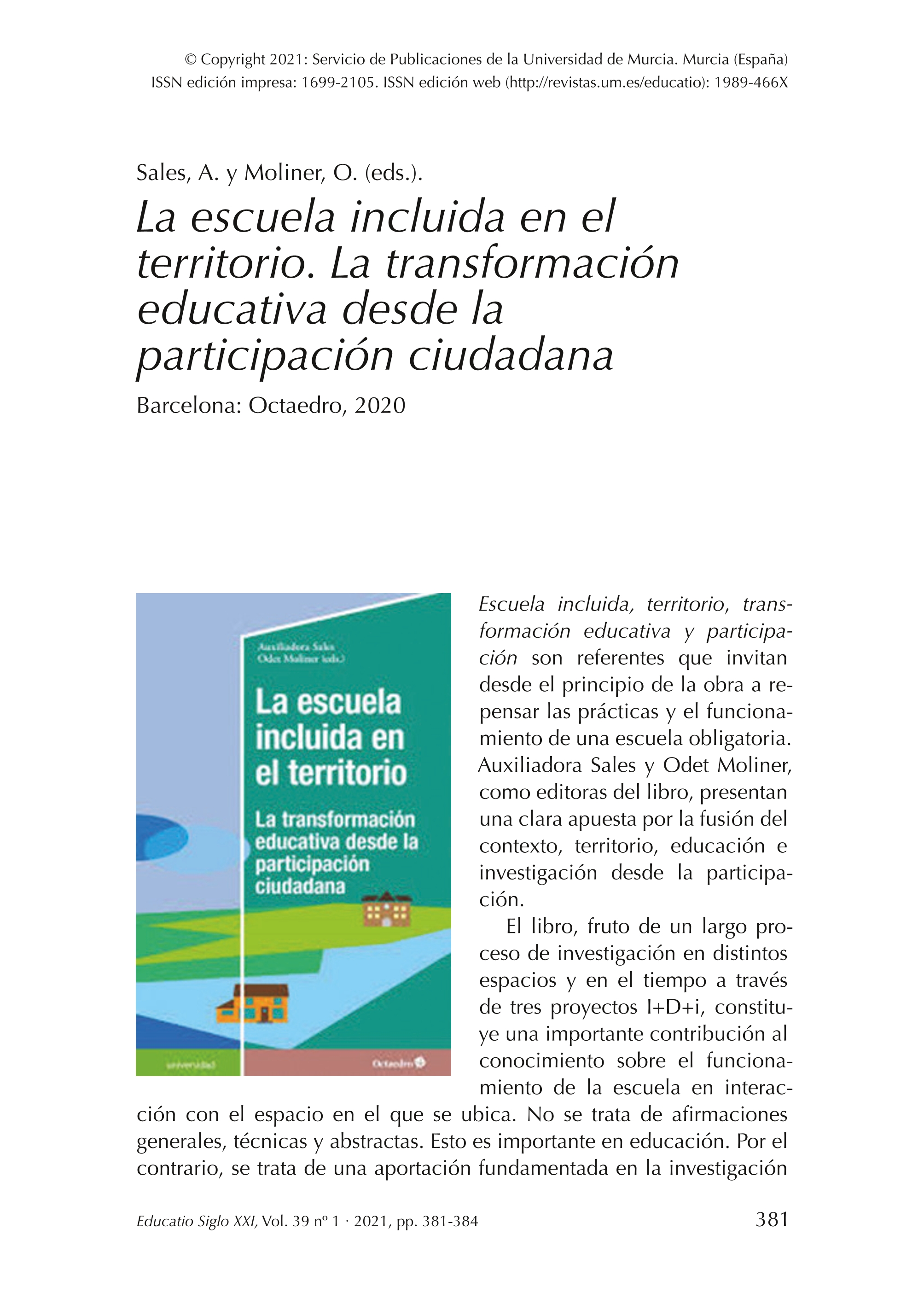 Sales, A. y Moliner, O. (eds.). La escuela incluida en el territorio. La transformación educativa desde la participación ciudadana. Barcelona: Octaedro, 2020