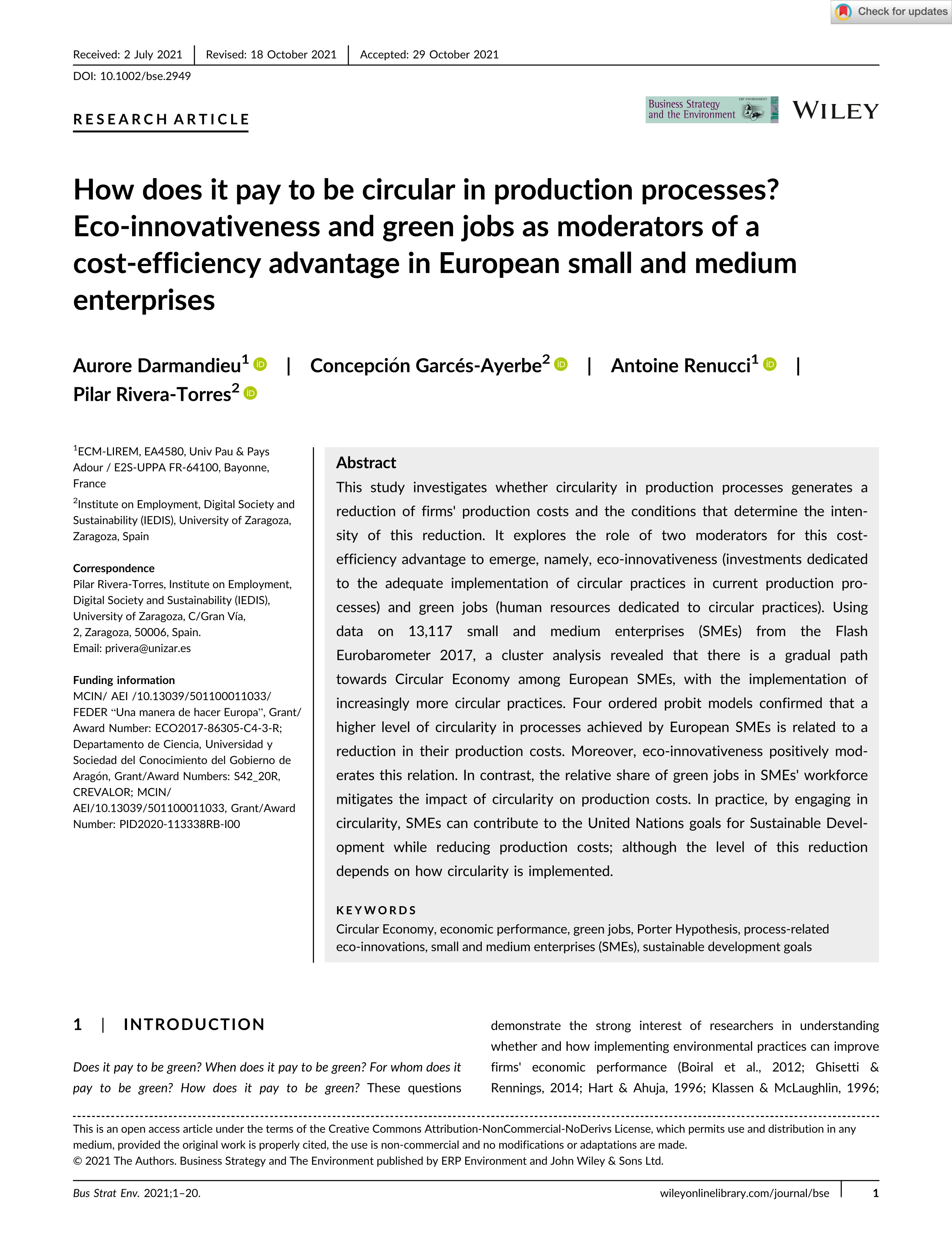 How does it pay to be circular in production processes? Eco-innovativeness and green jobs as moderators of a cost-efficiency advantage in European small and medium enterprises