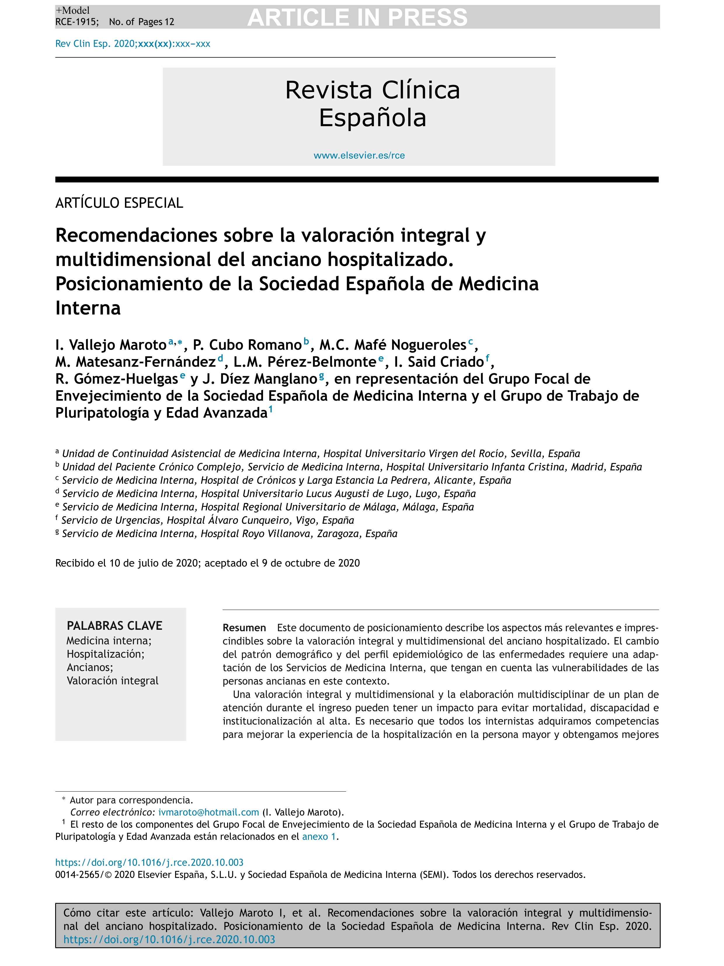 Recomendaciones sobre la valoración integral y multidimensional del anciano hospitalizado. Posicionamiento de la Sociedad Española de Medicina Interna