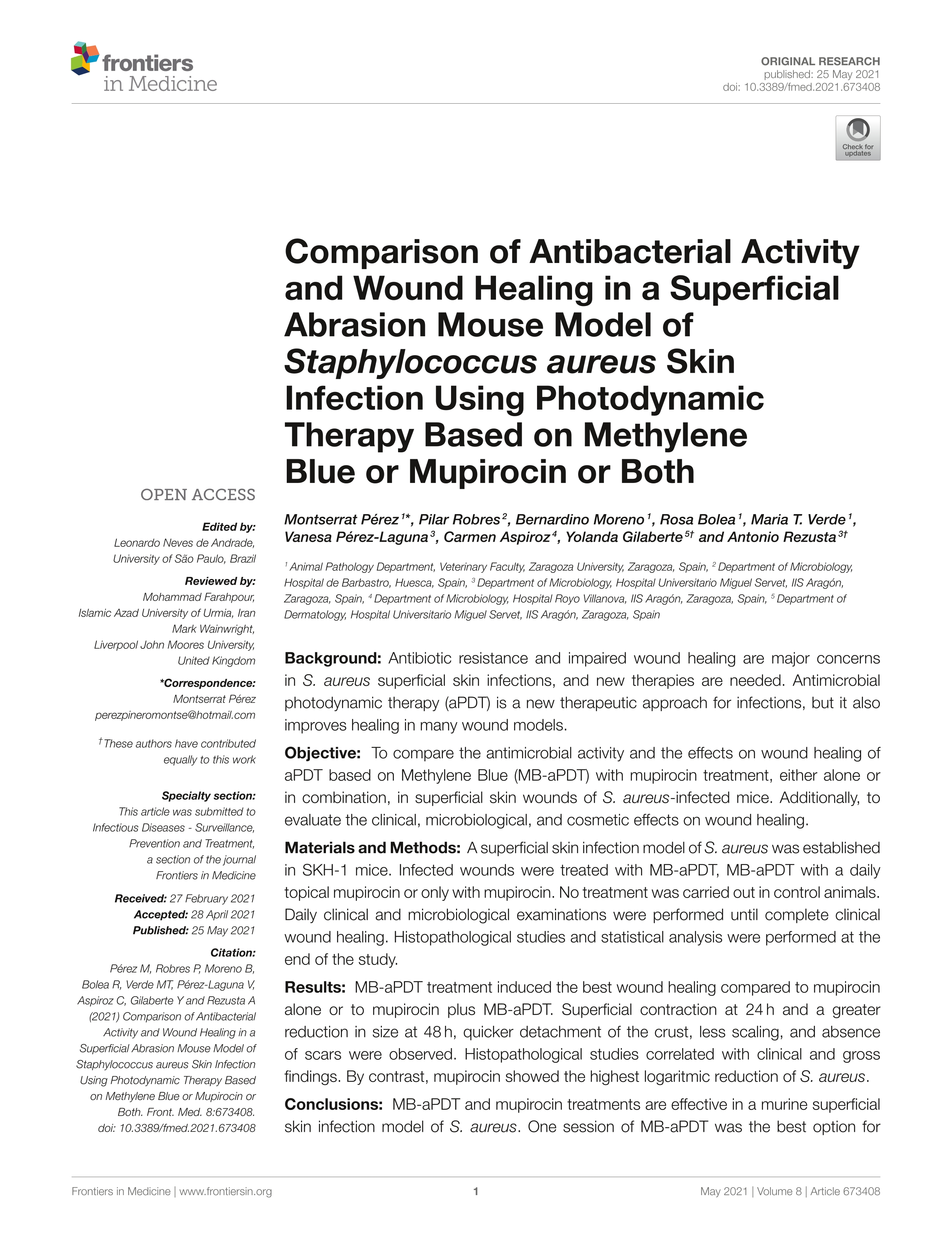 | Página principal > Artículos > Comparison of Antibacterial Activity and Wound Healing in a Superficial Abrasion Mouse Model of Staphylococcus aureus Skin Infection Using Photodynamic Therapy Based on Methylene Blue or Mupirocin or Both |