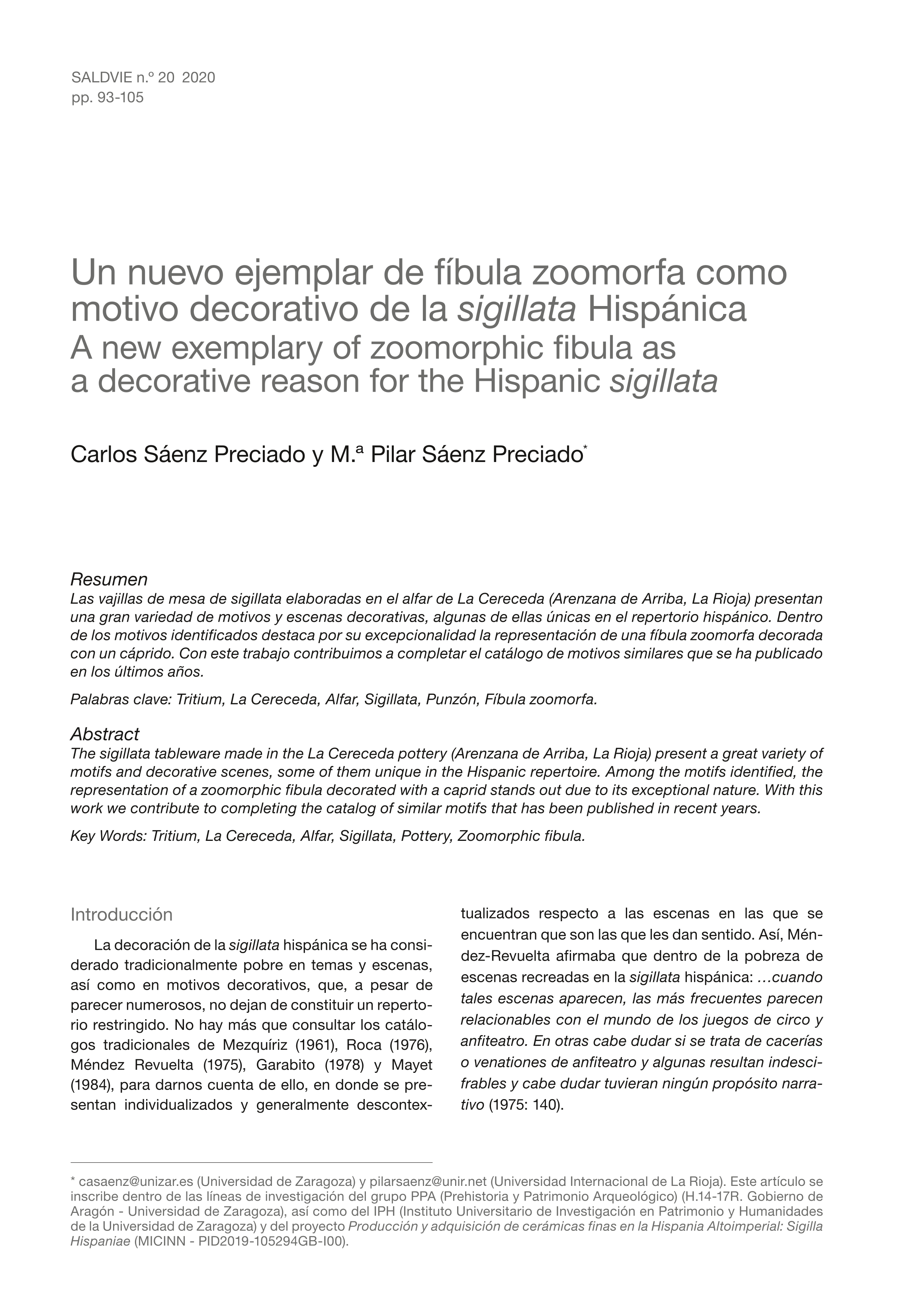 Resumen: Las vajillas de mesa de sigillata elaboradas en el alfar de La Cereceda (Arenzana de Arriba, La Rioja) presentan una gran variedad de motivos y escenas decorativas, algunas de ellas únicas en el repertorio hispánico. Dentro de los motivos identificados destaca por su excepcionalidad la representación de una fíbula zoomorfa decorada con un cáprido. Con este trabajo contribuimos a completar el catálogo de motivos similares que se ha publicado en los últimos años. Idioma: Español Año: 2020 Publicado en: Salduie (Zaragoza) 20 (2020), 93-105 ISSN: 1576-6454 Financiación: info:eu-repo/grantAgreement/ES/AEI/PID2019-105294GB-I00 Financiación: info:eu-repo/grantAgreement/ES/DGA/H14-17R Tipo y forma: Artículo (Versión definitiva) Área (Departamento): Área Arqueología (Dpto. Ciencias de la Antigüed.)