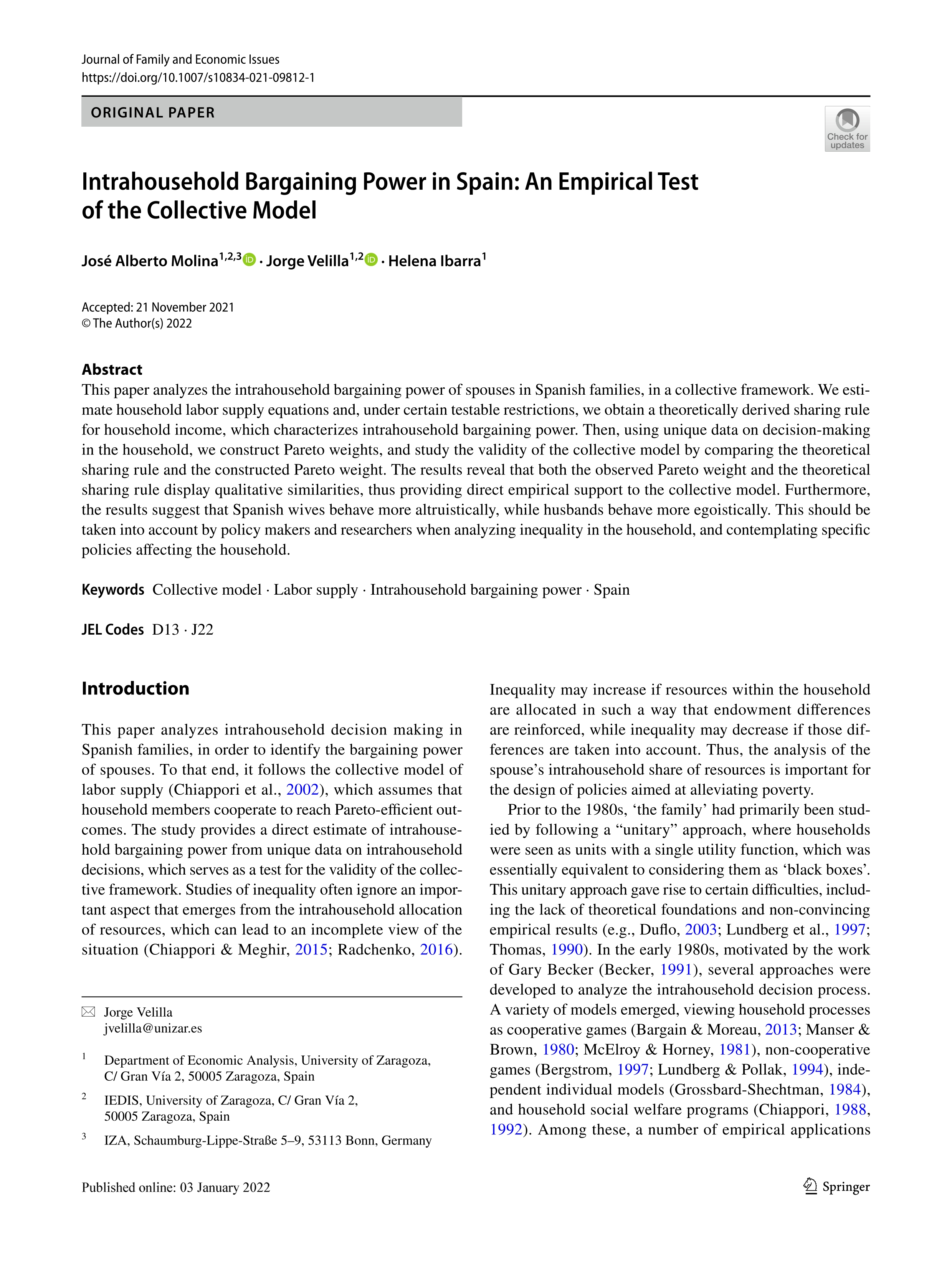 Resumen: This paper analyzes the intrahousehold bargaining power of spouses in Spanish families, in a collective framework. We estimate household labor supply equations and, under certain testable restrictions, we obtain a theoretically derived sharing rule for household income, which characterizes intrahousehold bargaining power. Then, using unique data on decision-making in the household, we construct Pareto weights, and study the validity of the collective model by comparing the theoretical sharing rule and the constructed Pareto weight. The results reveal that both the observed Pareto weight and the theoretical sharing rule display qualitative similarities, thus providing direct empirical support to the collective model. Furthermore, the results suggest that Spanish wives behave more altruistically, while husbands behave more egoistically. This should be taken into account by policy makers and researchers when analyzing inequality in the household, and contemplating specific policies affecting the household. Idioma: Inglés DOI: 10.1007/s10834-021-09812-1 Año: 2023 Publicado en: Journal of Family and Economic Issues 44 (2023), 84–97 ISSN: 1058-0476 Factor impacto JCR: 2.3 (2023) Categ. JCR: FAMILY STUDIES rank: 17 / 66 = 0.258 (2023) - Q2 - T1 Categ. JCR: ECONOMICS rank: 175 / 600 = 0.292 (2023) - Q2 - T1 Factor impacto CITESCORE: 5.1 - Economics and Econometrics (Q1) - Social Psychology (Q2)