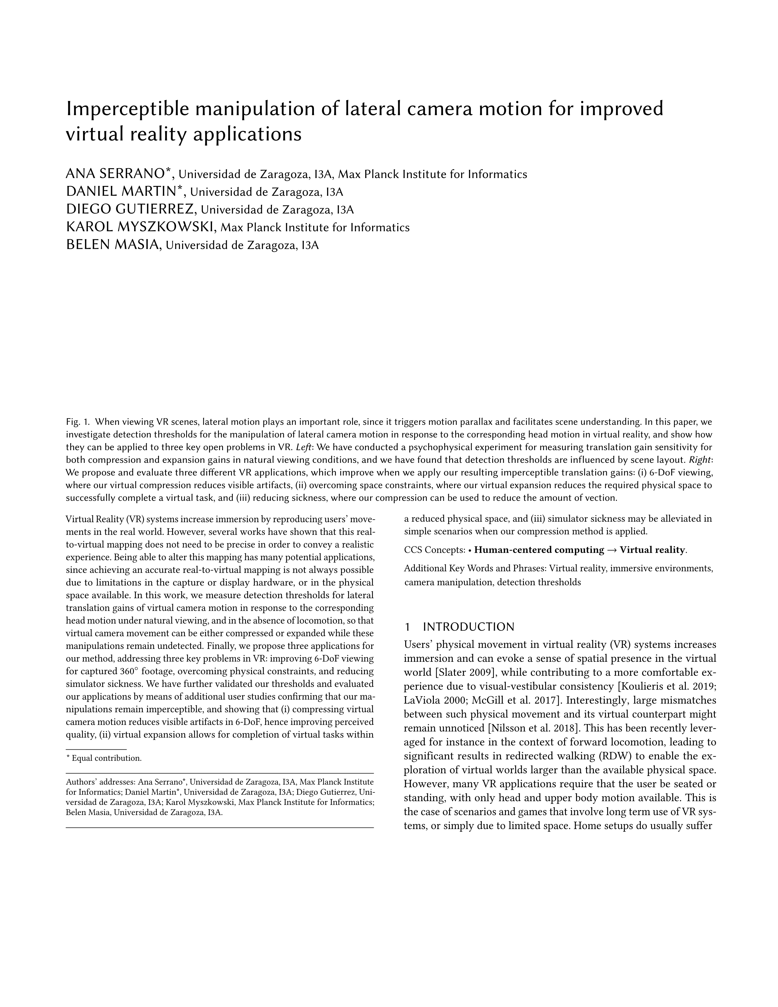 Resumen: Virtual Reality (VR) systems increase immersion by reproducing users' movements in the real world. However, several works have shown that this real-to-virtual mapping does not need to be precise in order to convey a realistic experience. Being able to alter this mapping has many potential applications, since achieving an accurate real-to-virtual mapping is not always possible due to limitations in the capture or display hardware, or in the physical space available. In this work, we measure detection thresholds for lateral translation gains of virtual camera motion in response to the corresponding head motion under natural viewing, and in the absence of locomotion, so that virtual camera movement can be either compressed or expanded while these manipulations remain undetected. Finally, we propose three applications for our method, addressing three key problems in VR: improving 6-DoF viewing for captured 360° footage, overcoming physical constraints, and reducing simulator sickness. We have further validated our thresholds and evaluated our applications by means of additional user studies confirming that our manipulations remain imperceptible, and showing that (i) compressing virtual camera motion reduces visible artifacts in 6-DoF, hence improving perceived quality, (ii) virtual expansion allows for completion of virtual tasks within a reduced physical space, and (iii) simulator sickness may be alleviated in simple scenarios when our compression method is applied. Idioma: Inglés DOI: 10.1145/3414685.3417773 Año: 2020 Publicado en: ACM TRANSACTIONS ON GRAPHICS 39, 6 (2020), 267 [14 pp.] ISSN: 0730-0301 Factor impacto JCR: 5.414 (2020) Categ. JCR: COMPUTER SCIENCE, SOFTWARE ENGINEERING rank: 9 / 108 = 0.083 (2020) - Q1 - T1 Factor impacto SCIMAGO: 2.153 - Computer Graphics and Computer-Aided Design (Q1)