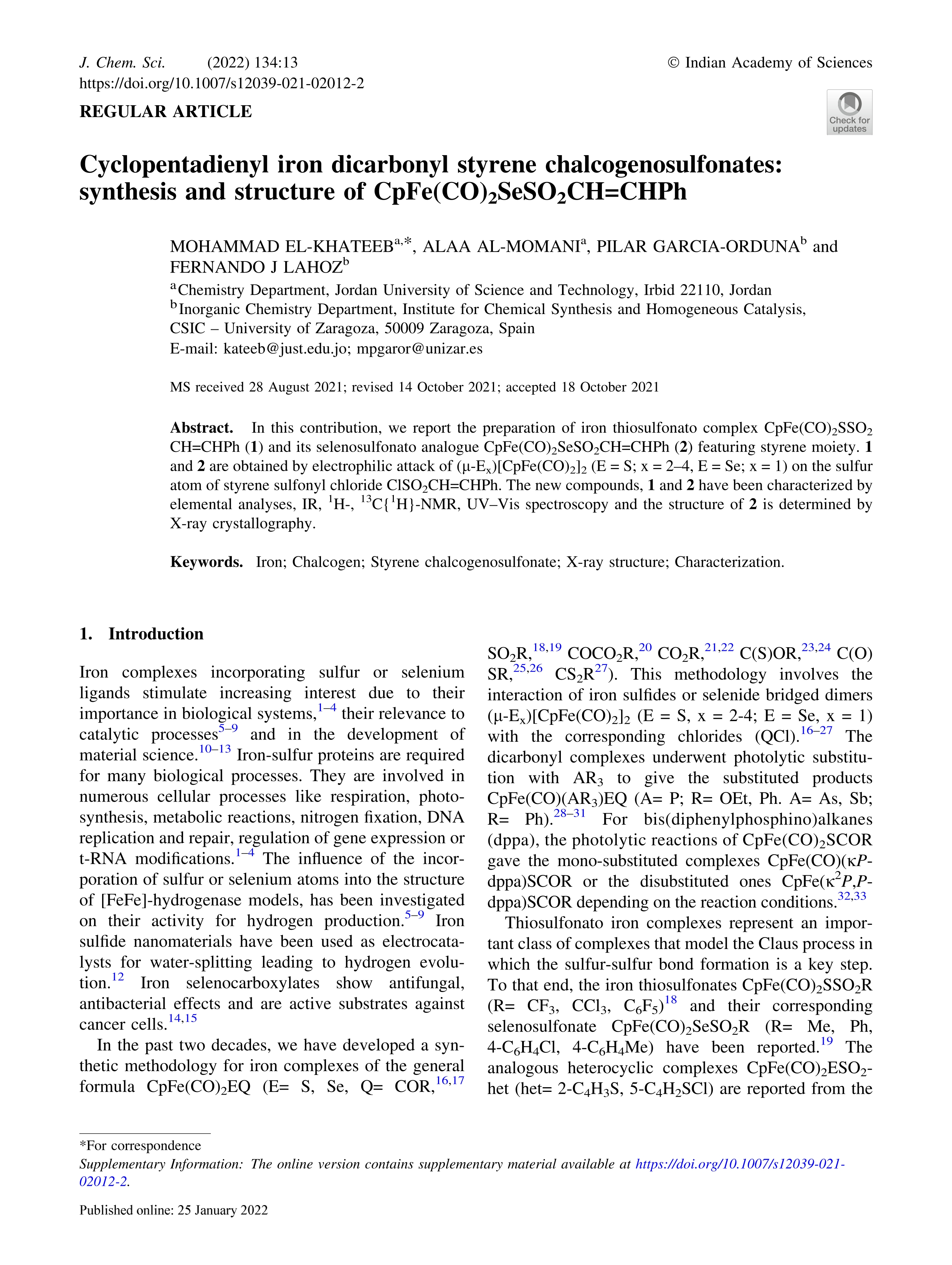 Cyclopentadienyl iron dicarbonyl styrene chalcogenosulfonates: synthesis and structure of CpFe(CO)(2)SeSO2CH=CHPh