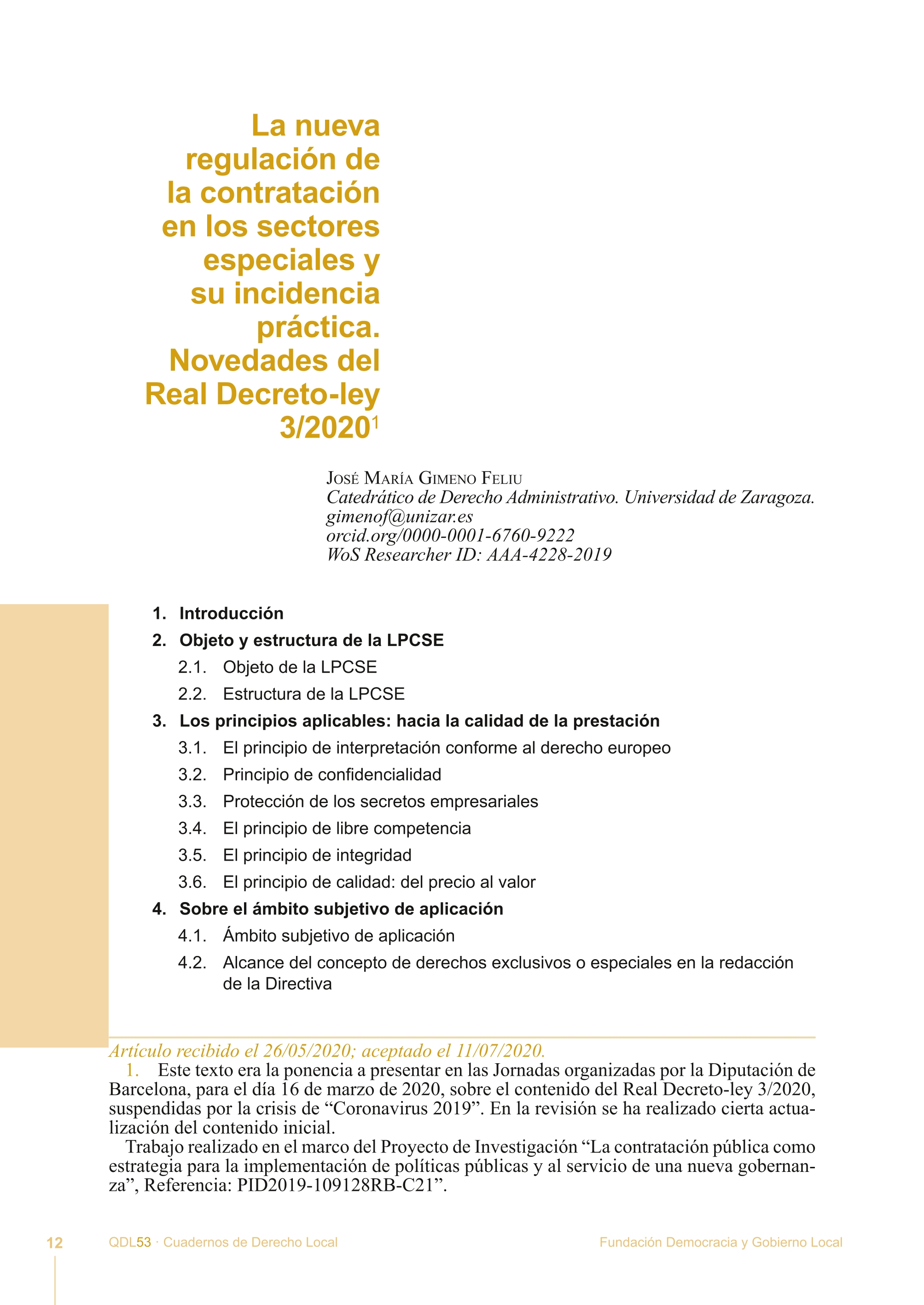 La nueva regulación de la contratación en los sectores especiales y su incidencia práctica. Novedades del Real Decreto-Ley 3/2020