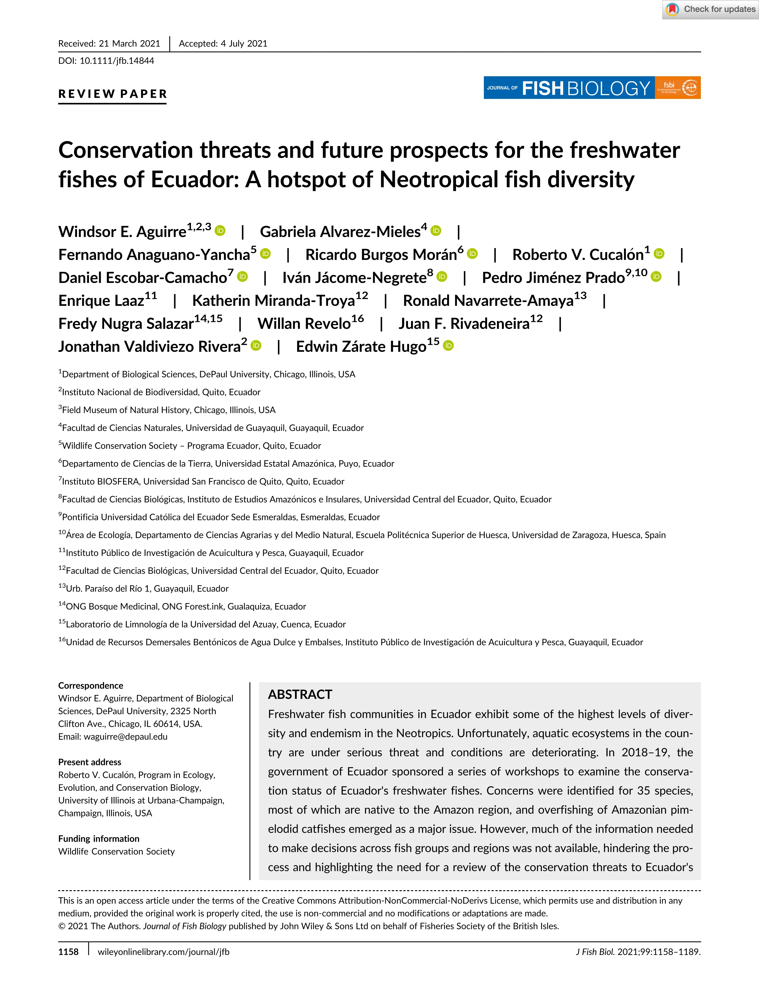 Conservation threats and future prospects for the freshwater fishes of Ecuador: A hotspot of Neotropical fish diversity