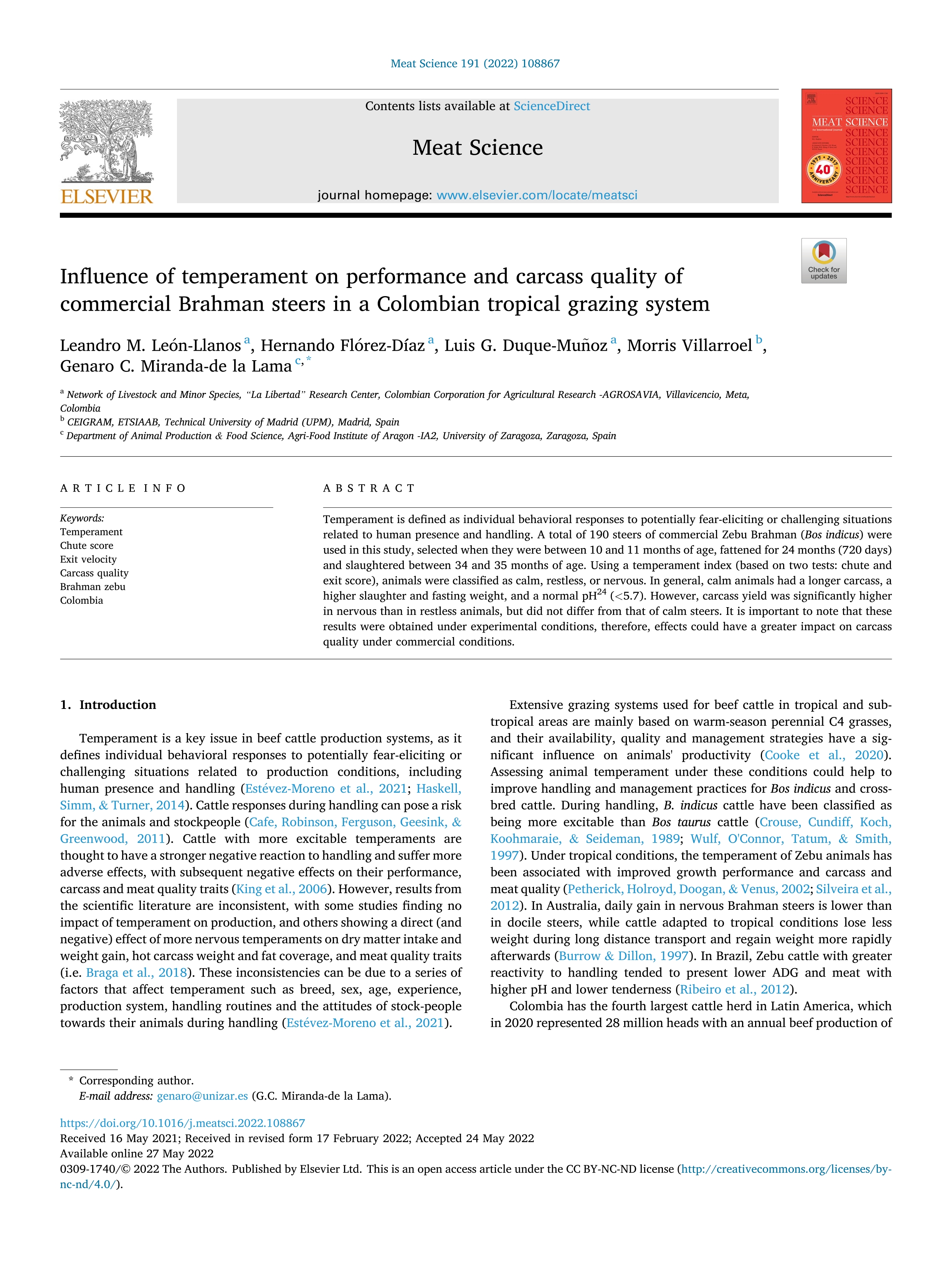 Influence of temperament on performance and carcass quality of commercial Brahman steers in a Colombian tropical grazing system