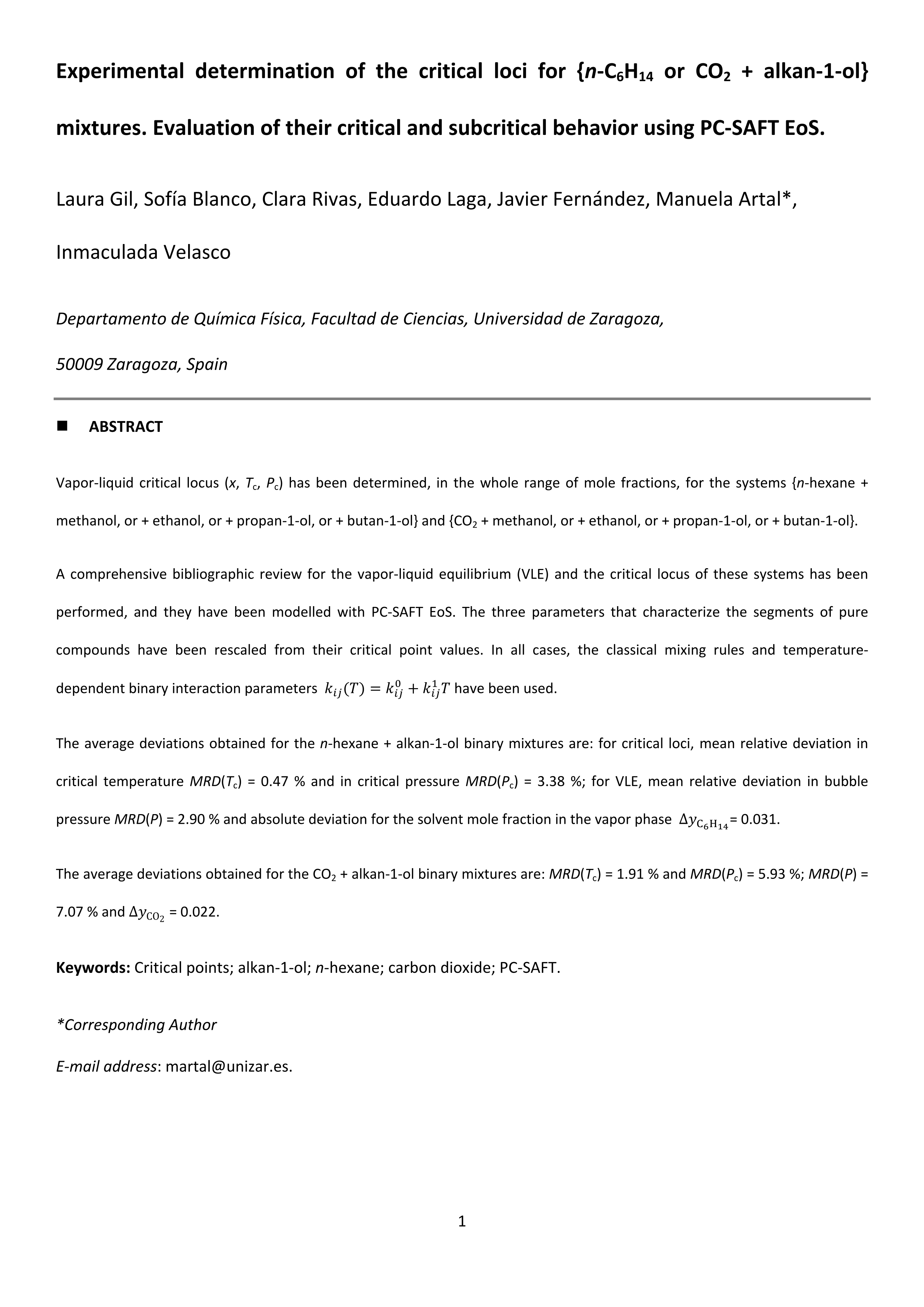 | Home > Articles > Experimental determination of the critical loci for {nC6H14 or CO2 + alkan1ol} mixtures. Evaluation of their critical and subcritical behavior using PCSAFT EoS. > Access to Fulltext |