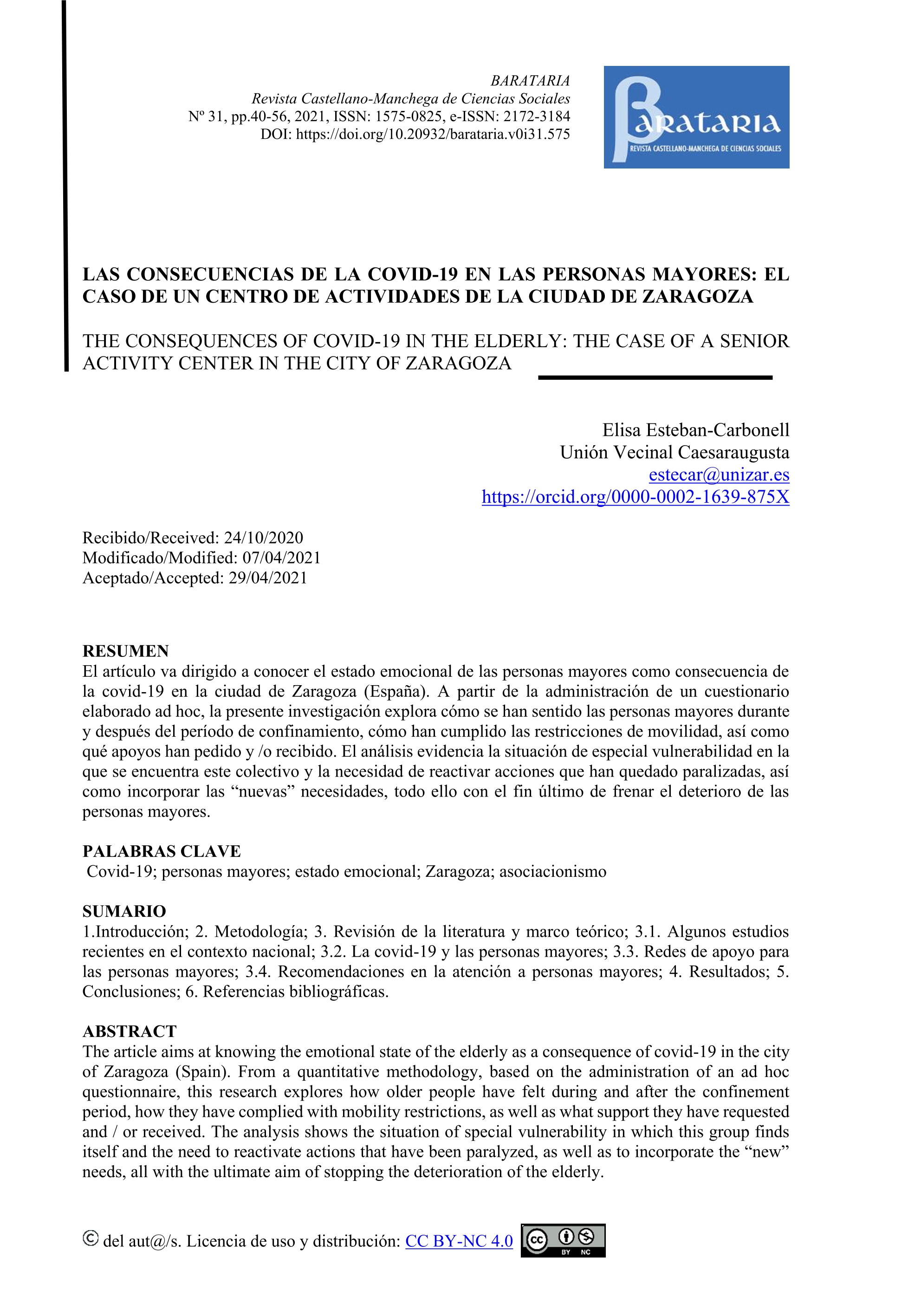 Las consecuencias de la covid-19 en las personas mayores: el caso de un centro de actividades de la ciudad de Zaragoza