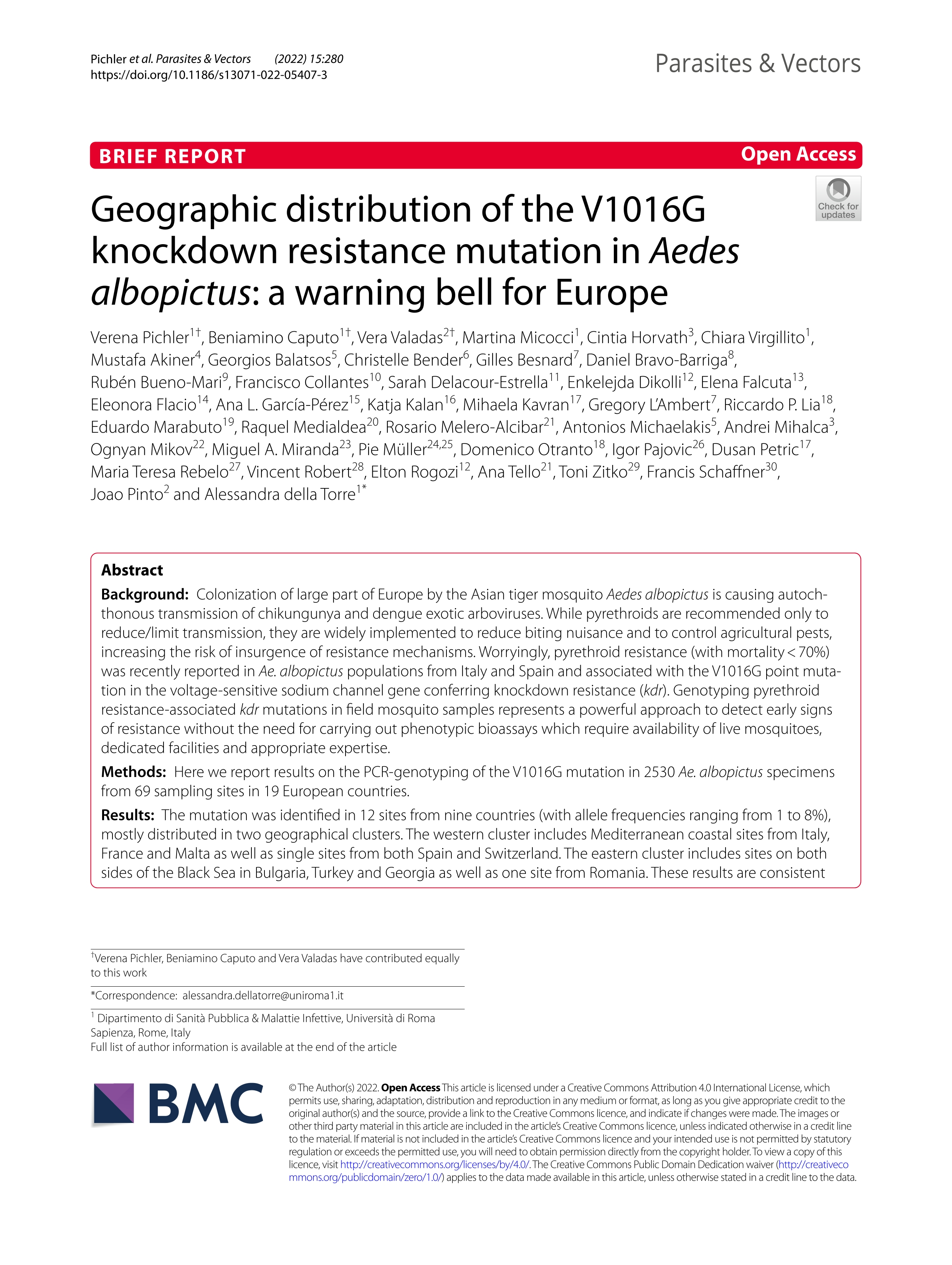| Página principal > Artículos > Geographic distribution of the V1016G knockdown resistance mutation in Aedes albopictus: a warning bell for Europe |