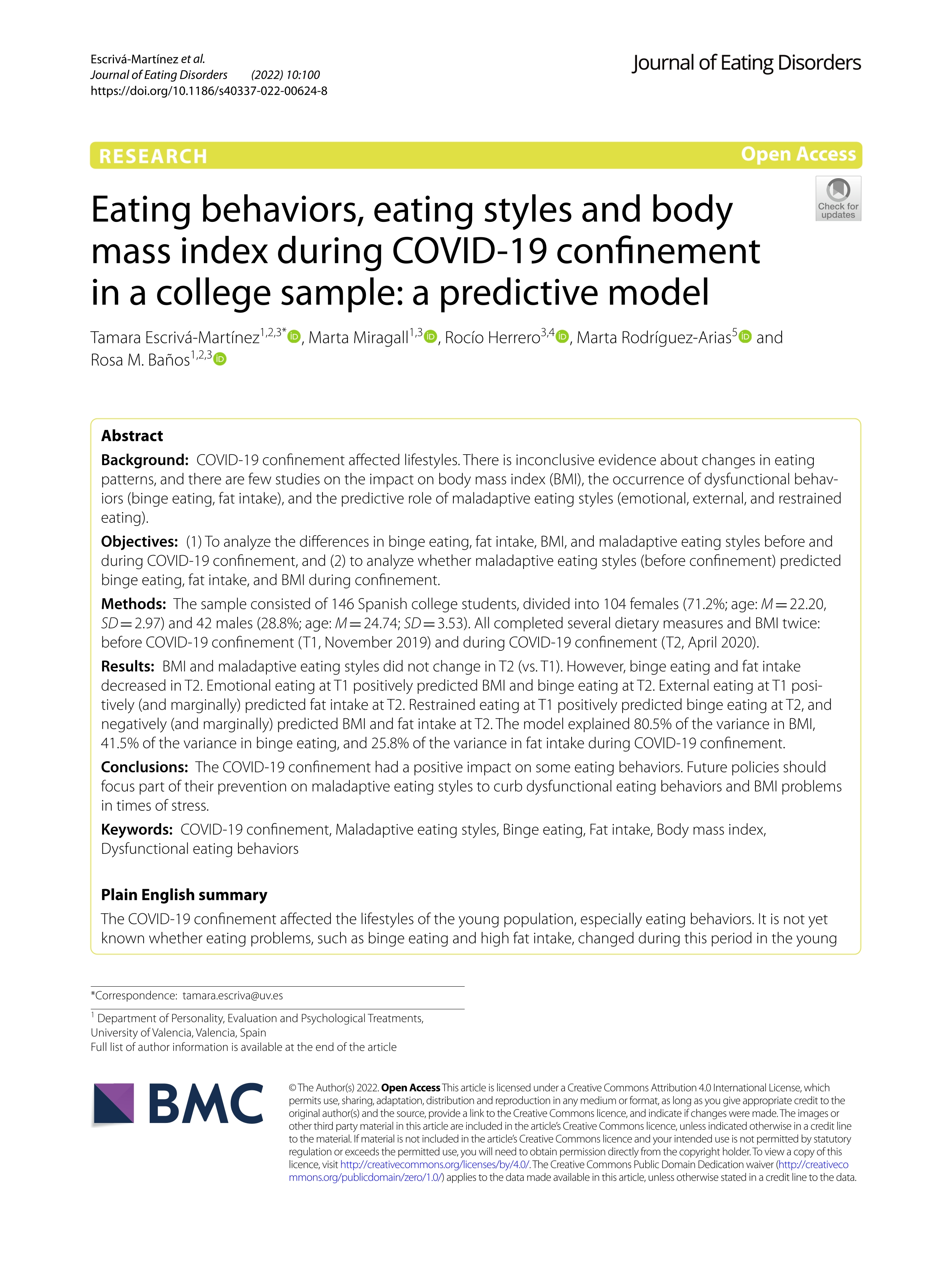 Eating behaviors, eating styles and body mass index during COVID-19 confinement in a college sample: a predictive model