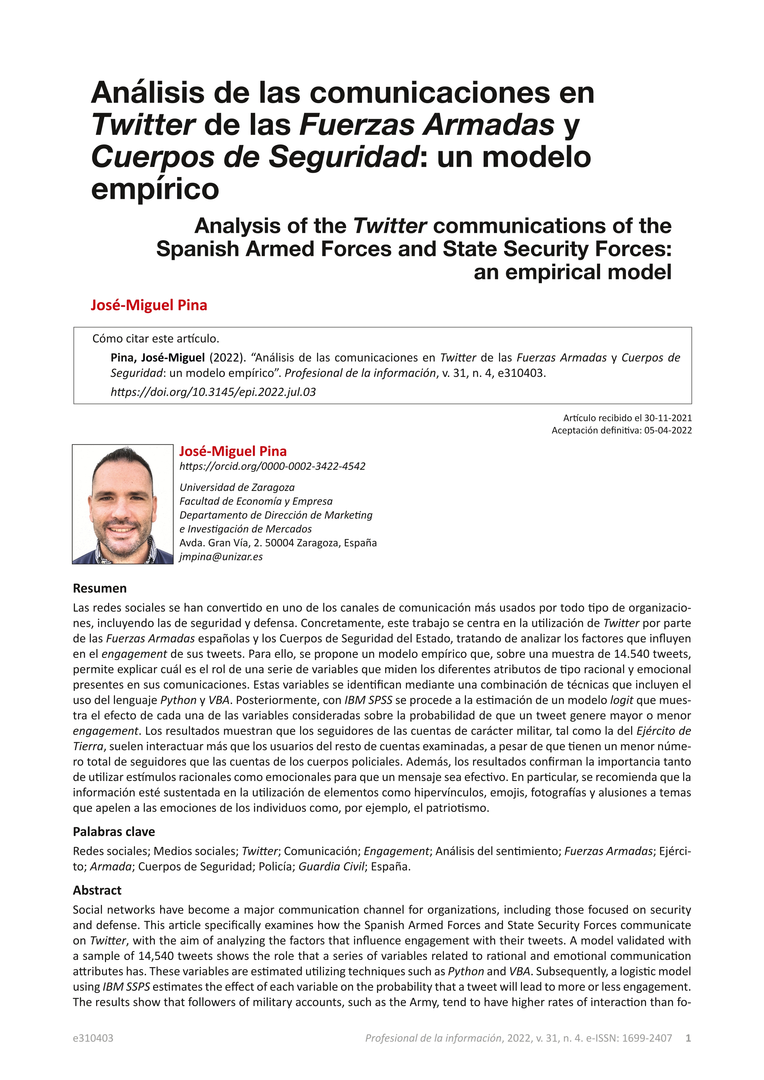 Análisis de las comunicaciones en Twitter de las Fuerzas Armadas y Cuerpos de Seguridad: un modelo empírico