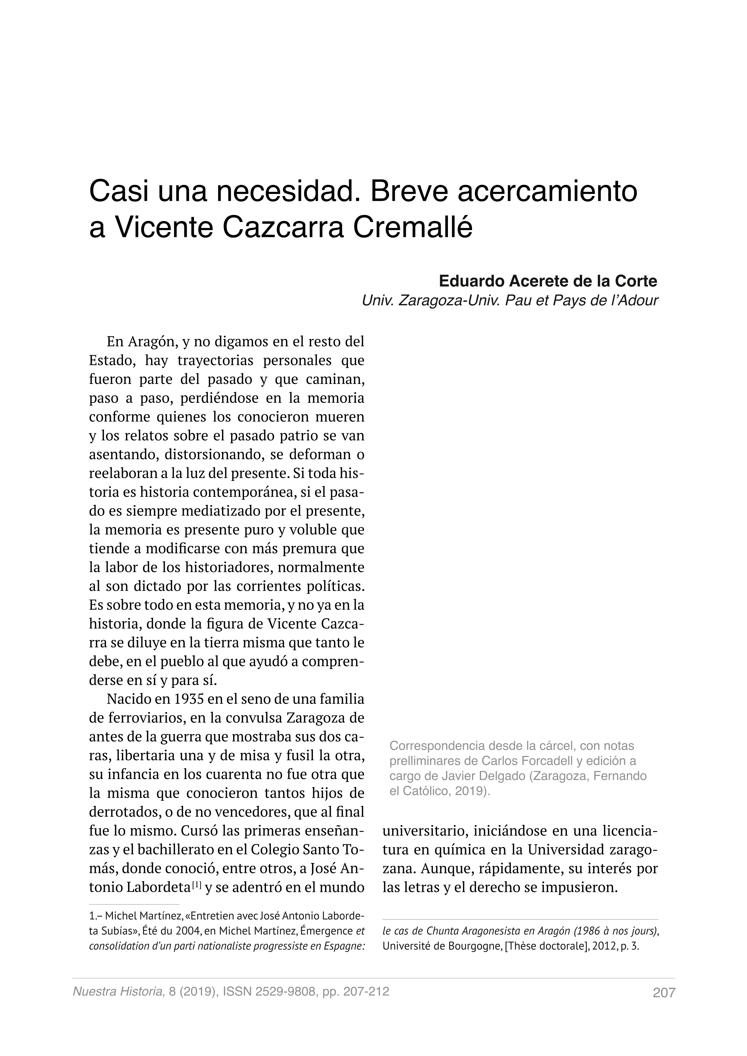 Casi una necesidad. Breve acercamiento a Vicente Cazcarra Cremallé
