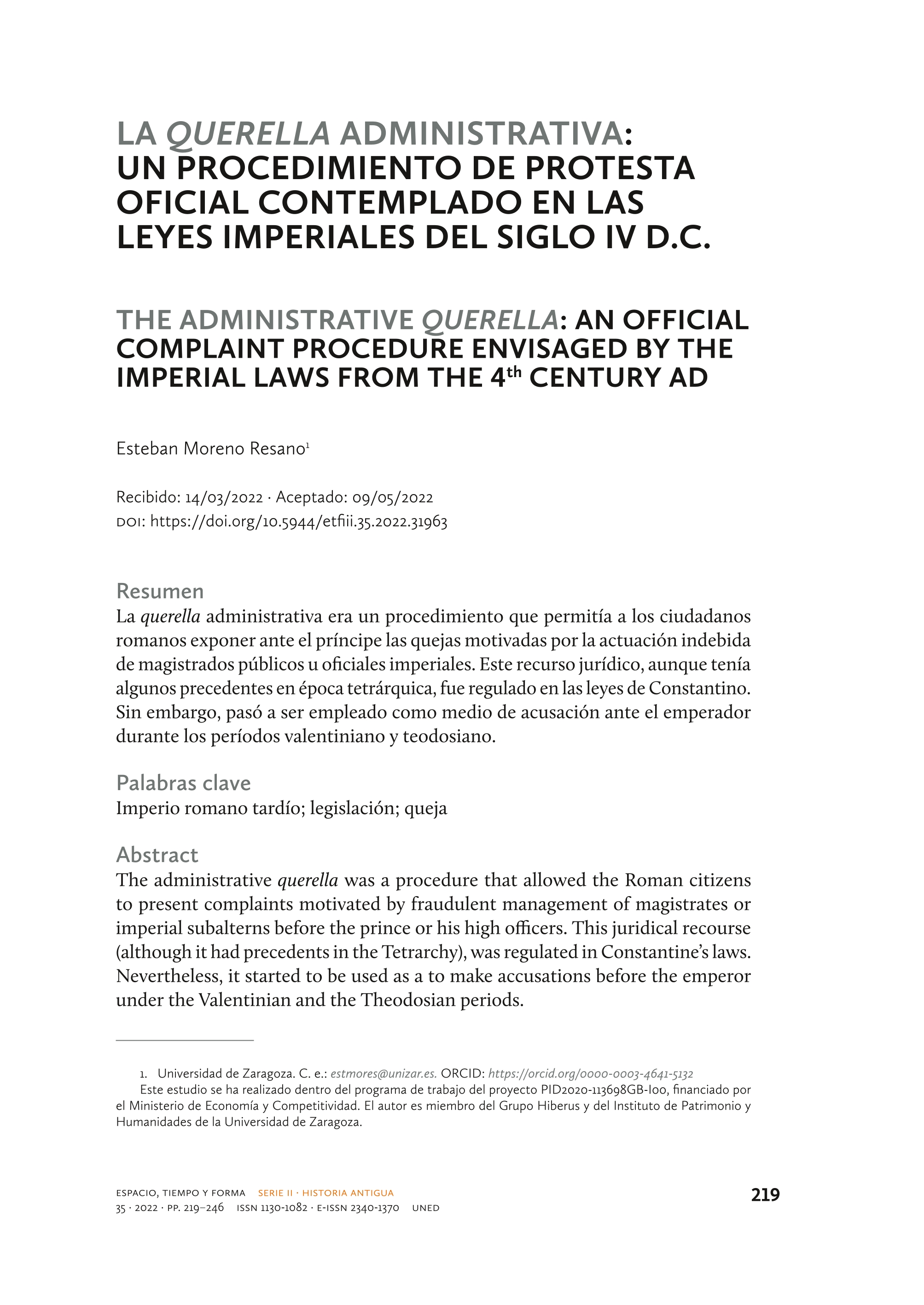 imperial subalterns before the prince or his high officers. This juridical recourse (although it had precedents in the Tetrarchy), was regulated in Constantine’s laws. Nevertheless, it started to be used as a to make accusations before the emperor under the Valentinian and the Theodosian periods. Idioma: Español DOI: 10.5944/etfiii.35.2022.31963 Año: 2022 Publicado en: Espacio, tiempo y forma. Serie II, Historia antigua 35 (2022), 219-246 ISSN: 1130-1082 Financiación: info:eu-repo/grantAgreement/ES/MINECO/PID2020-113698GB-I00 Tipo y forma: Artículo (Versión definitiva) Área (Departamento): Área Historia Antigua (Dpto. Ciencias de la Antigüed.)