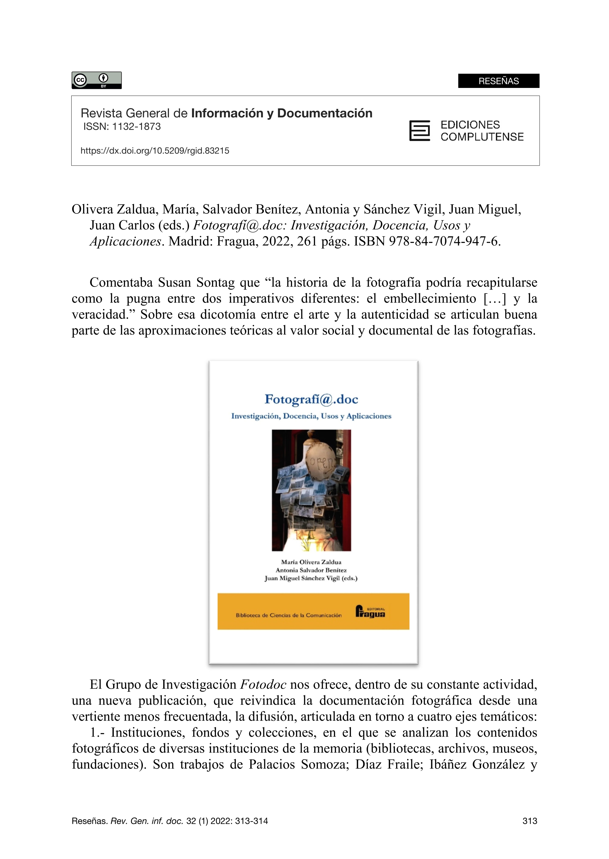 | Página principal > Artículos > Olivera Zaldua, María, Salvador Benítez, Antonia y Sánchez Vigil, Juan Miguel, Juan Carlos (eds.) Fotografí@.doc: Investigación, Docencia, Usos y Aplicaciones. Madrid: Fragua, 2022, 261 págs. ISBN 978-84-7074-947-6. |