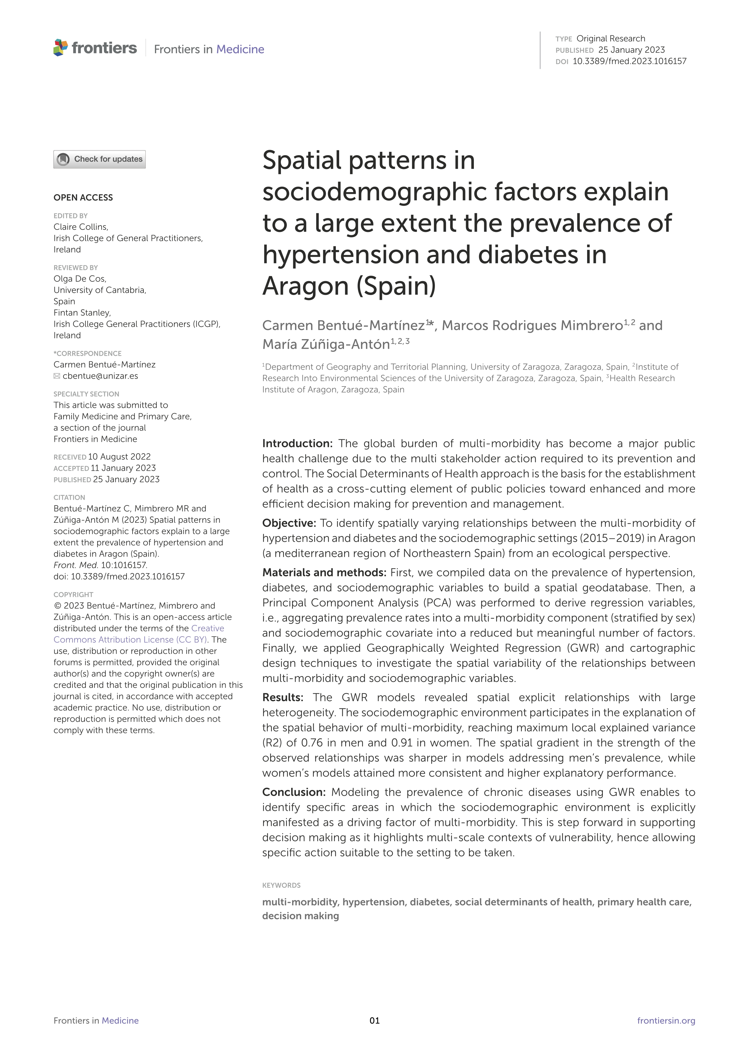 Conclusion: Modeling the prevalence of chronic diseases using GWR enables to identify specific areas in which the sociodemographic environment is explicitly manifested as a driving factor of multi-morbidity. This is step forward in supporting decision making as it highlights multi-scale contexts of vulnerability, hence allowing specific action suitable to the setting to be taken. Idioma: Inglés DOI: 10.3389/fmed.2023.1016157 Año: 2023 Publicado en: Frontiers in Medicine 10 (2023), 1016157 [11 pp.] ISSN: 2296-858X Factor impacto JCR: 3.1 (2023) Categ. JCR: MEDICINE, GENERAL & INTERNAL rank: 57 / 329 = 0.173 (2023) - Q1 - T1 Factor impacto CITESCORE: 5.1 - Medicine (all) (Q1)