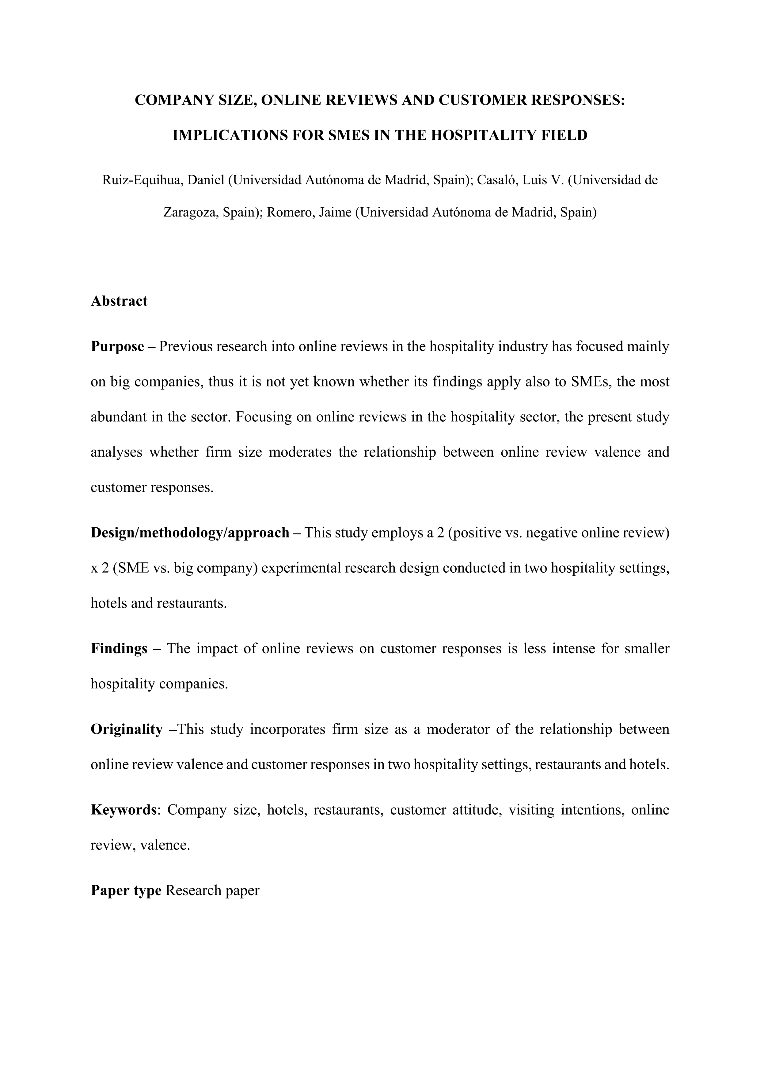 | Página principal > Artículos > Company size, online reviews and customer responses: implications for SMEs in the hospitality field |