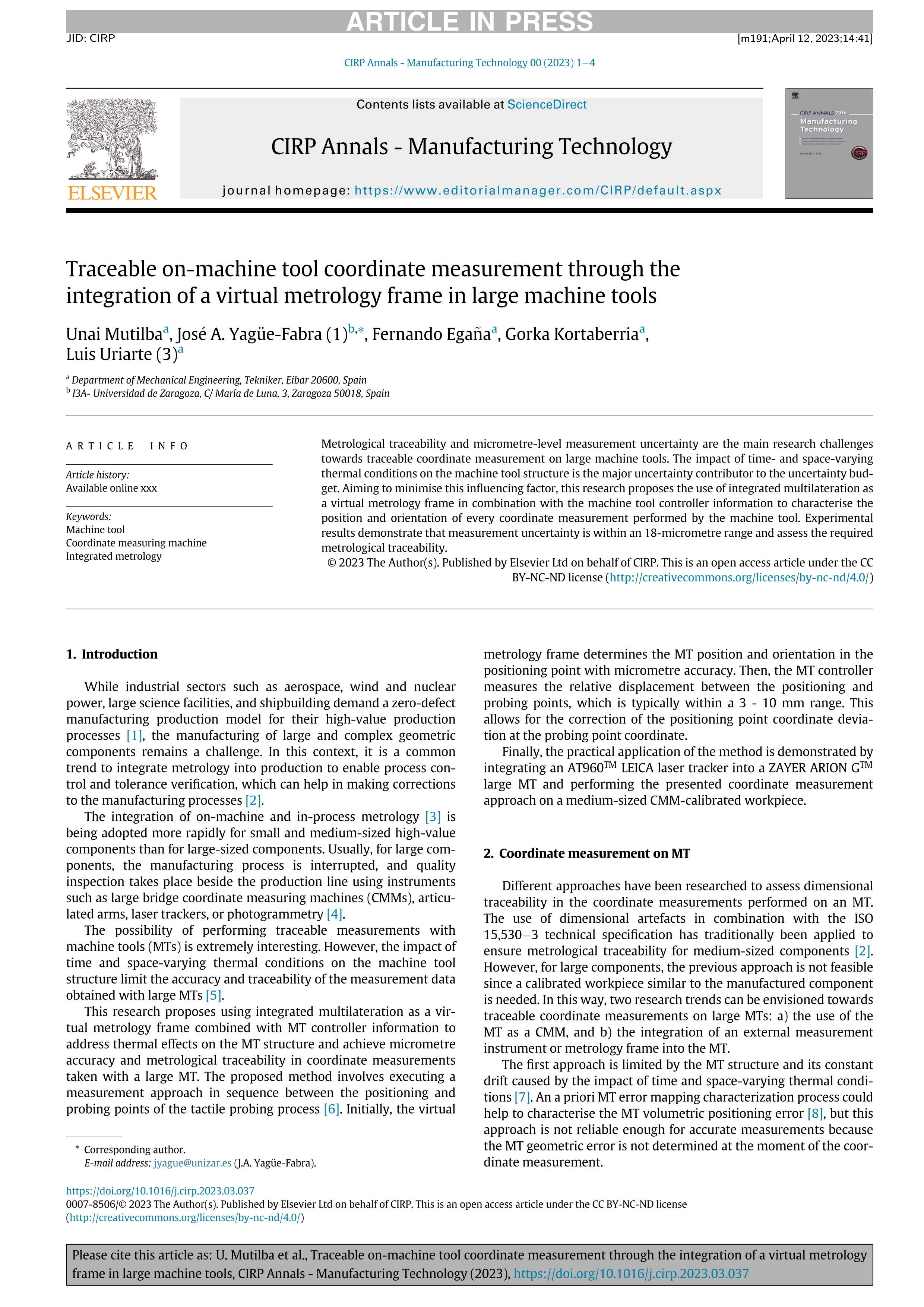 | Página principal > Artículos > Traceable on-machine tool coordinate measurement through the integration of a virtual metrology frame in large machine tools |