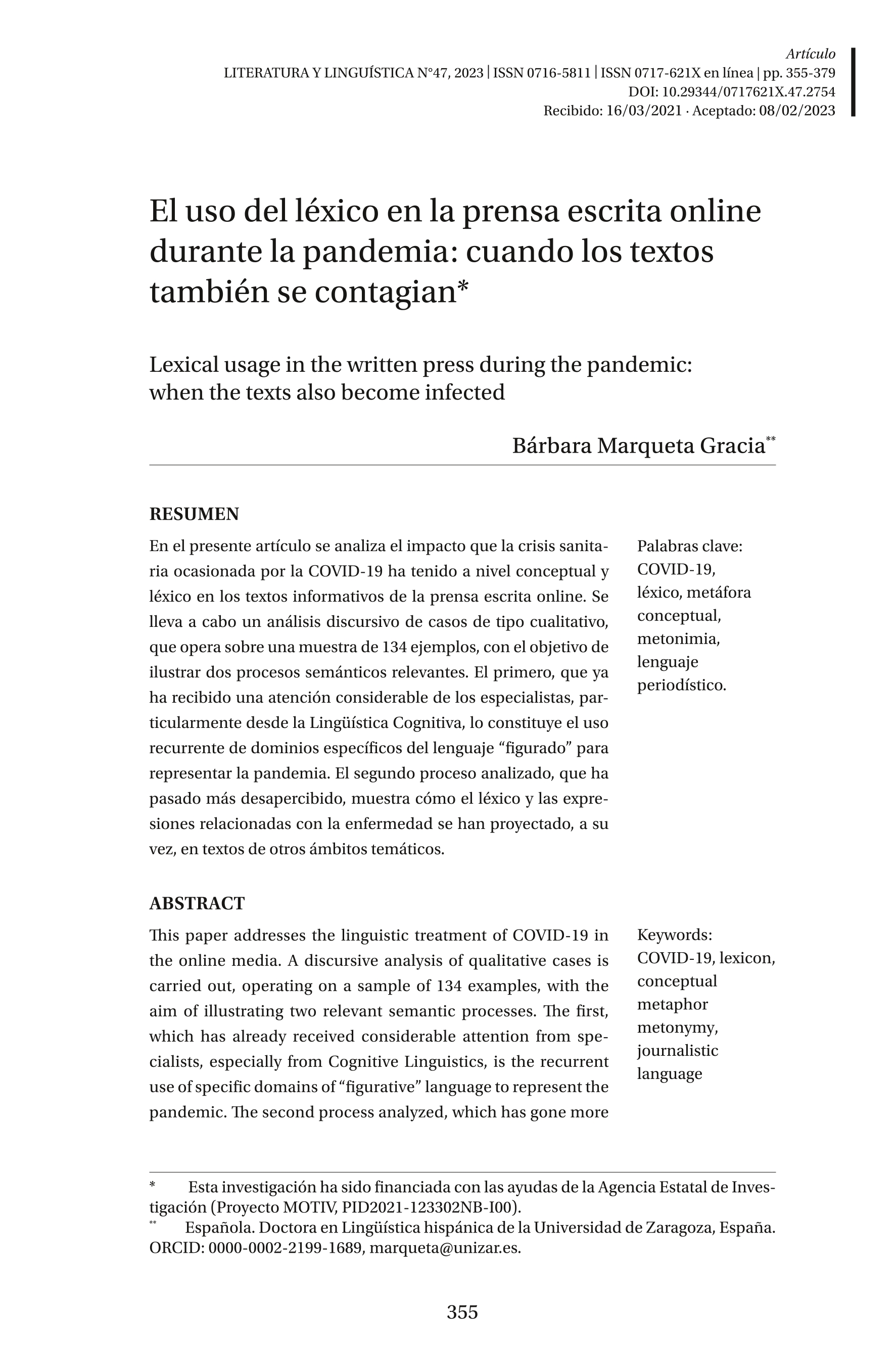 El uso del léxico en la prensa escrita online durante la pandemia: cuando los textos también se contagian