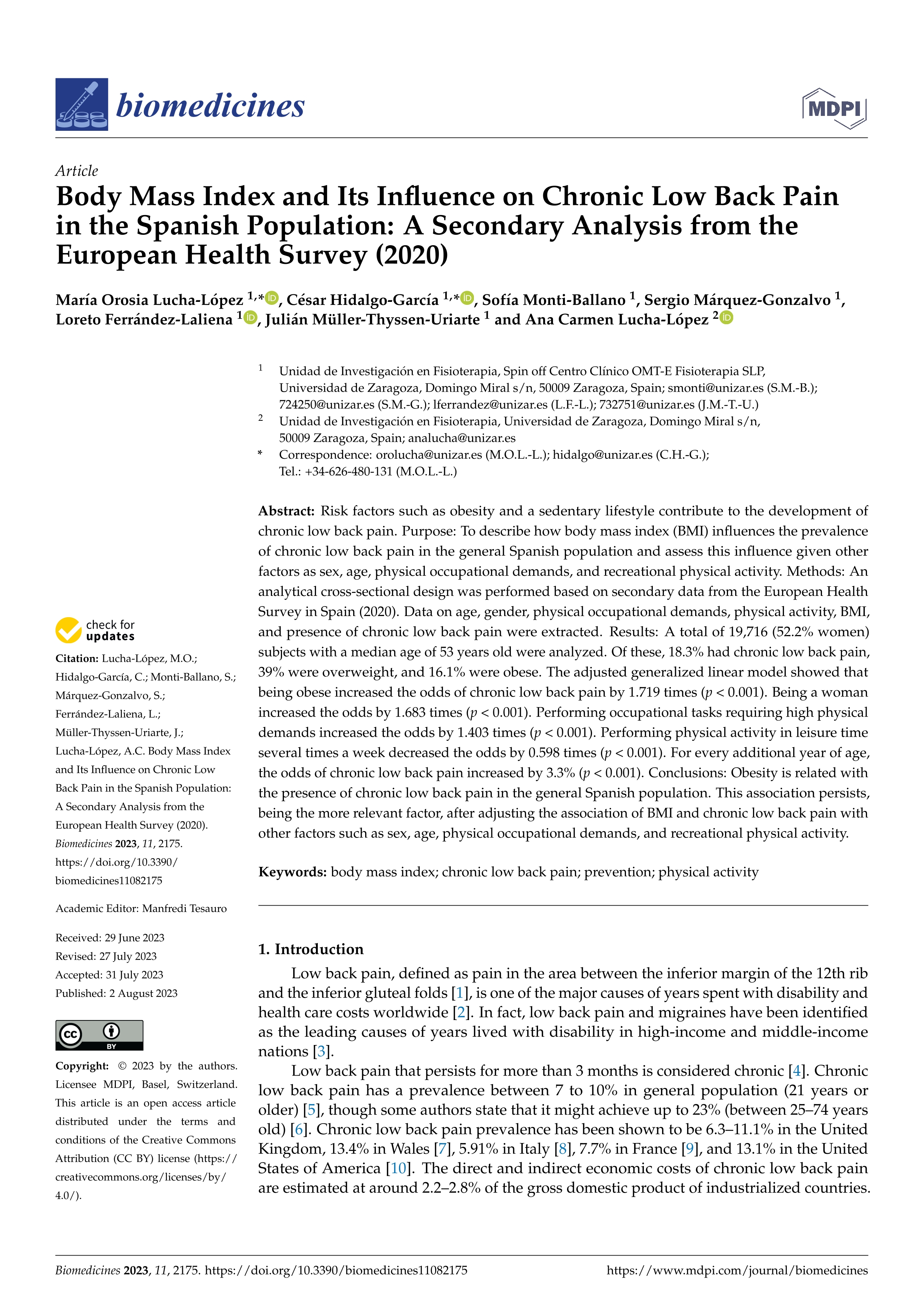 | Página principal > Artículos > Body mass index and its influence on chronic low back pain in the Spanish population: a secondary analysis from the European health survey (2020) |