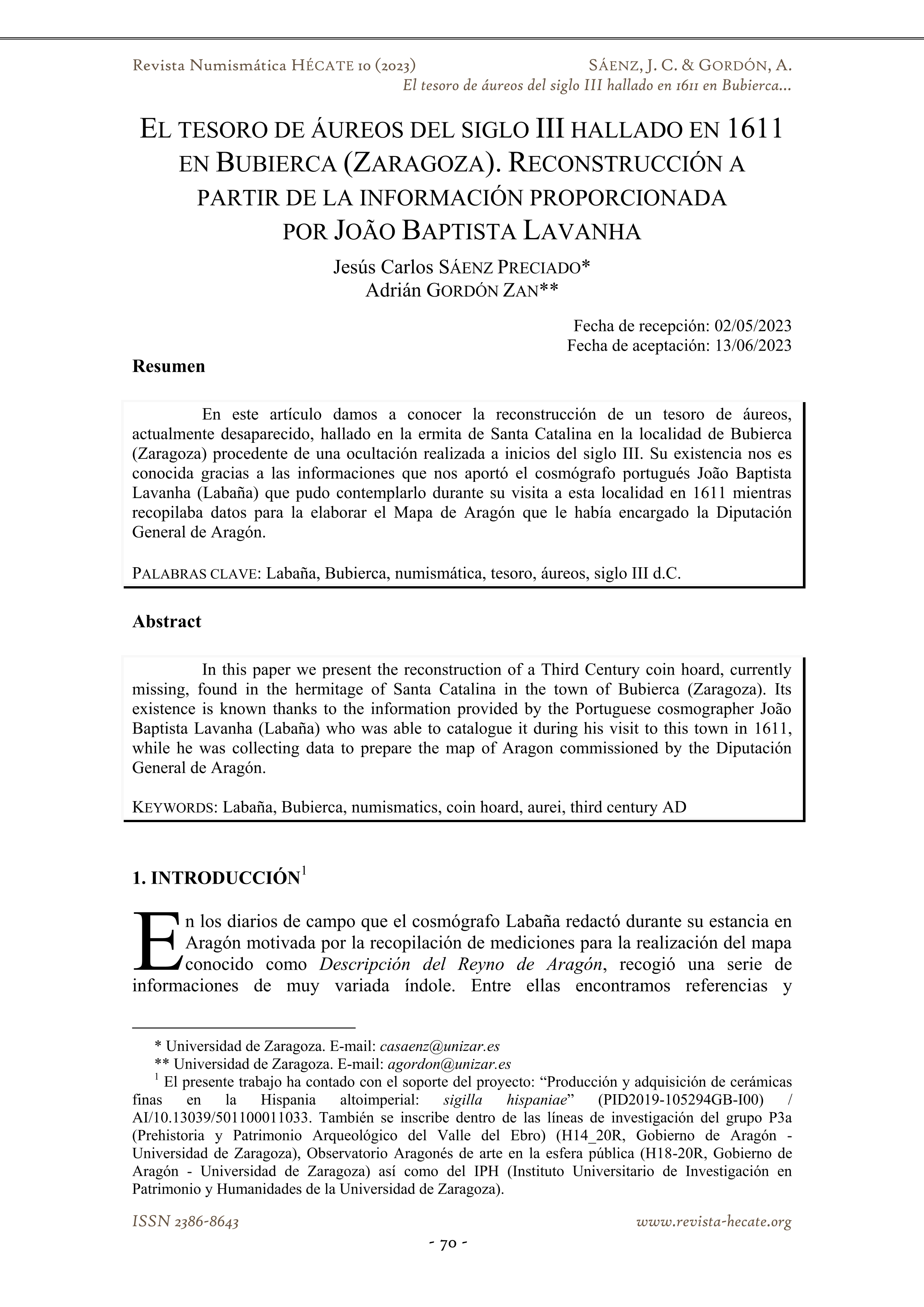 | Página principal > Artículos > El tesoro de áureos del siglo III hallado en 1611 en Bubierca (Zaragoza). Reconstrucción a partir de la información proporcionada por João Baptista Lavanha |