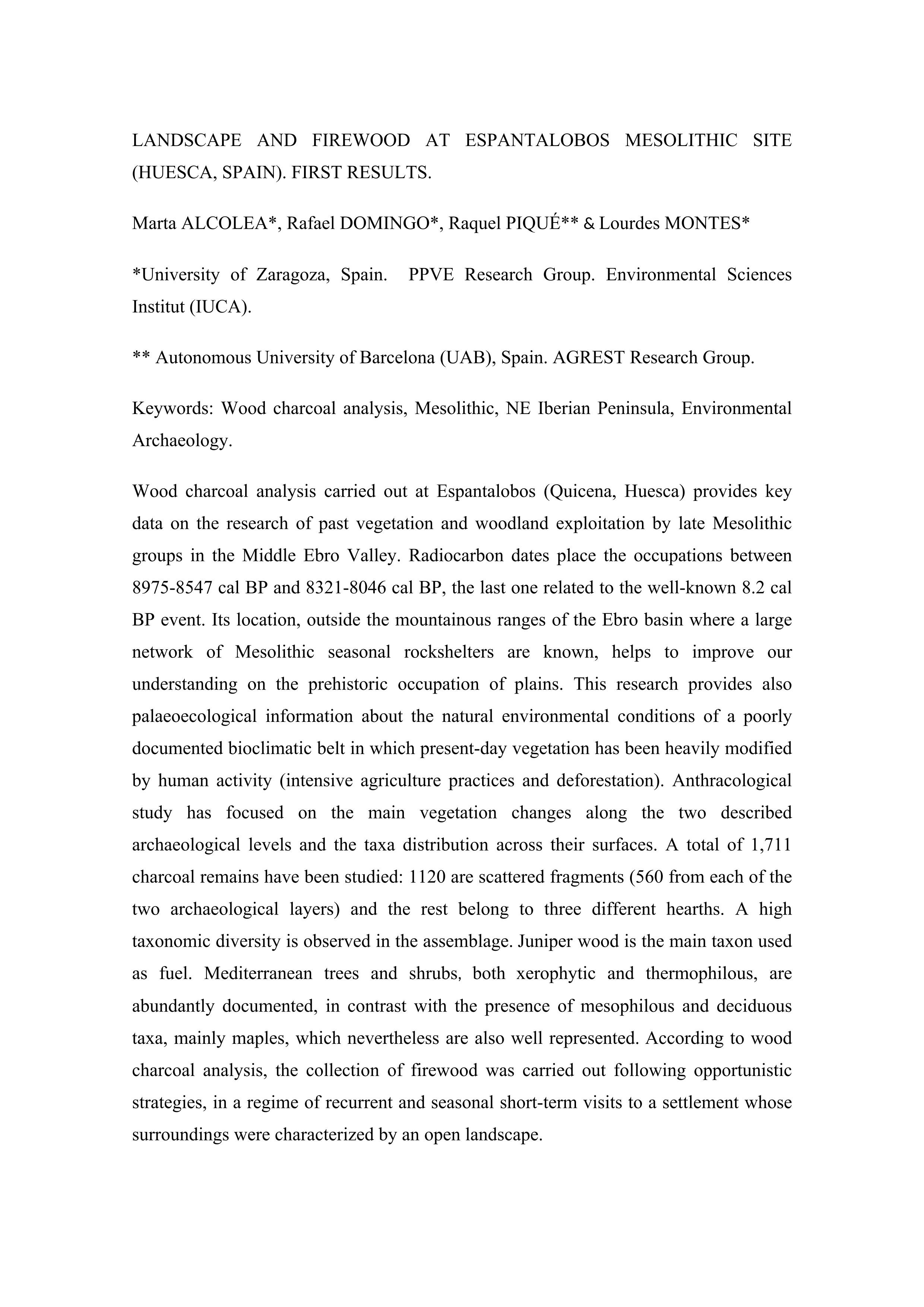 Resumen: Wood charcoal analysis carried out at Espantalobos (Quicena, Huesca) provides key data on the research of past vegetation and woodland exploitation by late Mesolithic groups in the middle Ebro Valley. Radiocarbon dates place the occupations between 8975-8547 cal BP and 8321-8046 cal BP, the last one related to the well-known 8.2 cal BP event. Its location, outside the mountainous ranges of the Ebro Basin where a large network of Mesolithic seasonal rockshelters are known, helps to improve our understanding on the prehistoric occupation of plains. This research provides also palaeoecological information about the natural environmental conditions of a poorly documented bioclimatic belt in which present-day vegetation has been heavily modified by human activity (intensive agriculture practices and deforestation). Anthracological study has focused on the main vegetation changes along the two described archaeological levels and the taxa distribution across their surfaces. A total of 1711 charcoal remains have been studied: 1120 are scattered fragments (560 from each of the two archaeological layers) and the rest belong to three different hearths. A high taxonomic diversity is observed in the assemblage. Juniper wood is the main taxon used as fuel. Mediterranean trees and shrubs, both xerophytic and thermophilous, are abundantly documented, in contrast with the presence of mesophilous and deciduous taxa, mainly maples, which nevertheless are also well represented. According to wood charcoal analysis, the collection of firewood was carried out following opportunistic strategies, in a regime of recurrent and seasonal short-term visits to a settlement whose surroundings were characterized by an open landscape. Idioma: Inglés DOI: 10.1016/j.quaint.2016.10.007 Año: 2017 Publicado en: Quaternary International 457 (2017), 198-210 ISSN: 1040-6182 Factor impacto JCR: 2.163 (2017) Categ. JCR: GEOSCIENCES, MULTIDISCIPLINARY rank: 85 / 189 = 0.45 (2017) - Q2 - T2 Categ. JCR: GEOGRAPHY, PHYSICAL rank: 29 / 49 = 0.592 (2017) - Q3 - T2 Factor impacto SCIMAGO: 1.123 - Earth-Surface Processes (Q1)