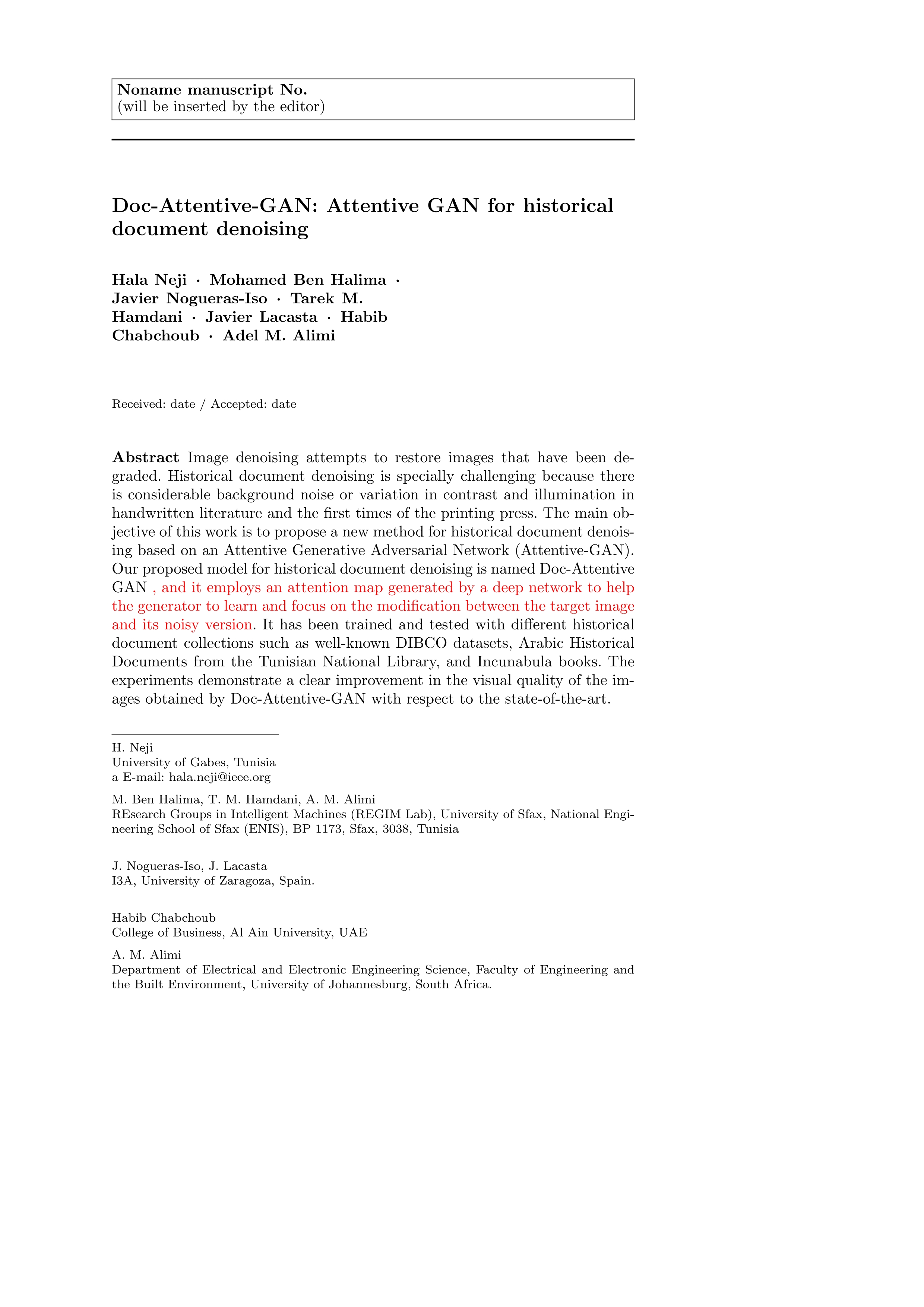 Doc-Attentive-GAN: attentive GAN for historical document denoising