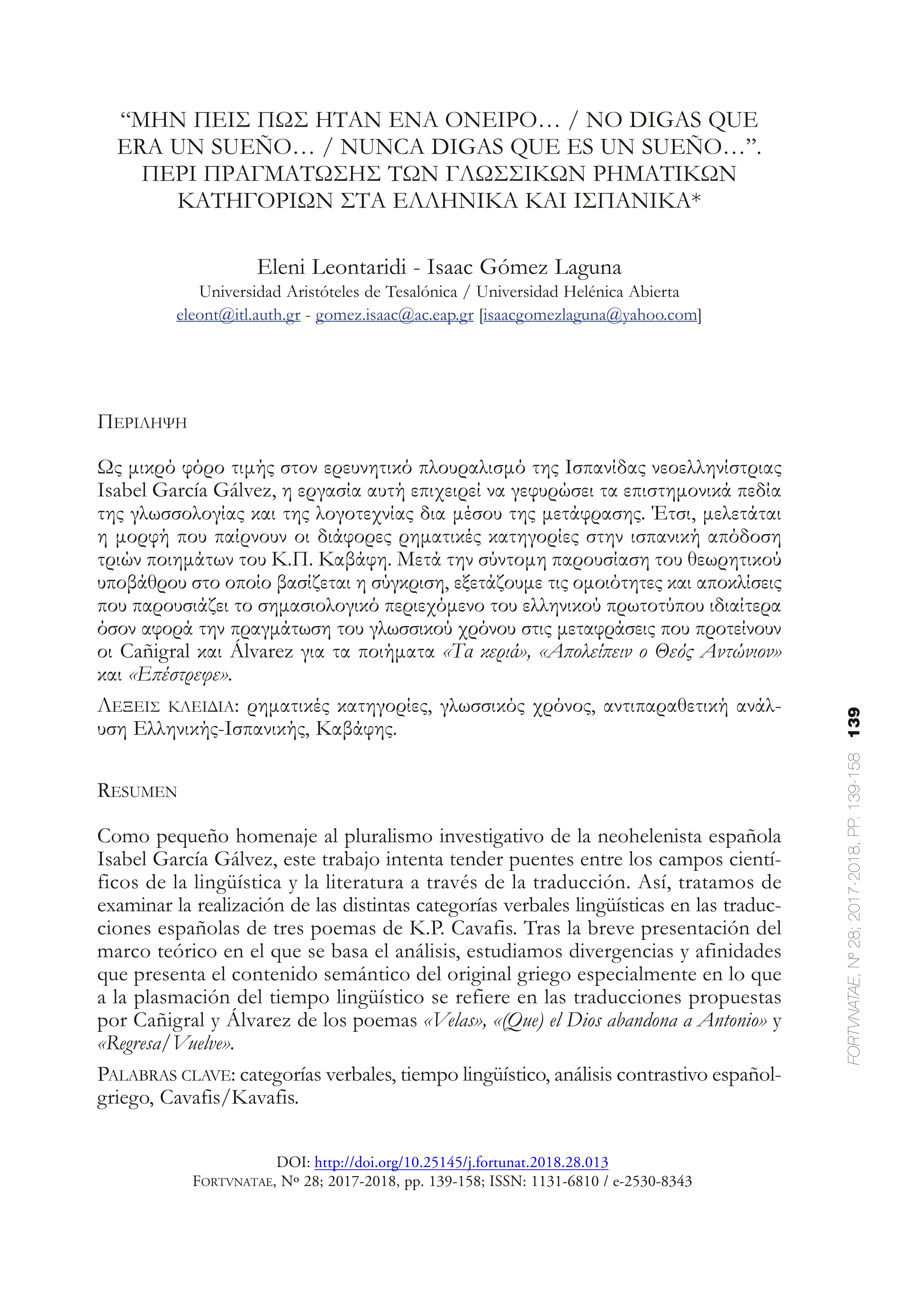| Página principal > Artículos > "No digas que fue un sueño... / No digas que era un sueño... / Nunca digas que es un sueño...". Sobre la realización de categorías verbales lingüísticas en griego y español |