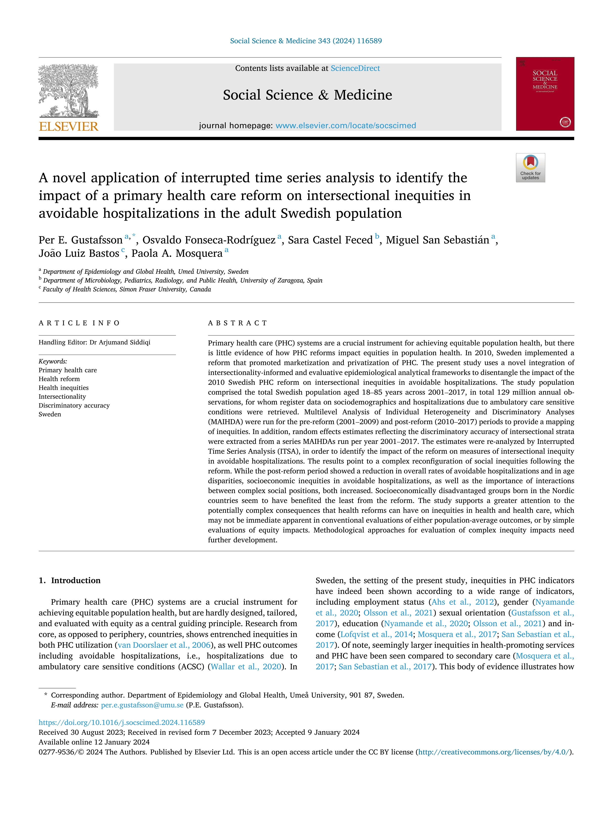 | Página principal > Artículos > A novel application of interrupted time series analysis to identify the impact of a primary health care reform on intersectional inequities in avoidable hospitalizations in the adult Swedish population |