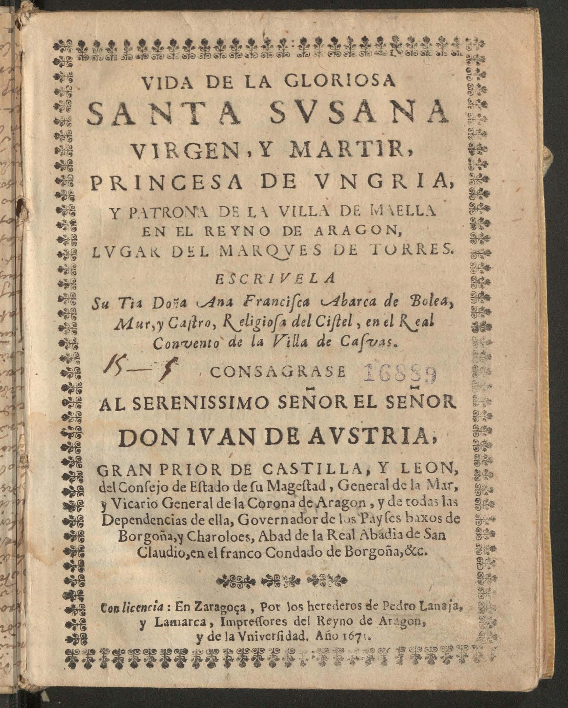 | Página principal > > Vida de la gloriosa Santa Susana, Virgen y Martir princessa de Ungria y patrona de la Villa de Maella ... / > Acceso al texto completo |