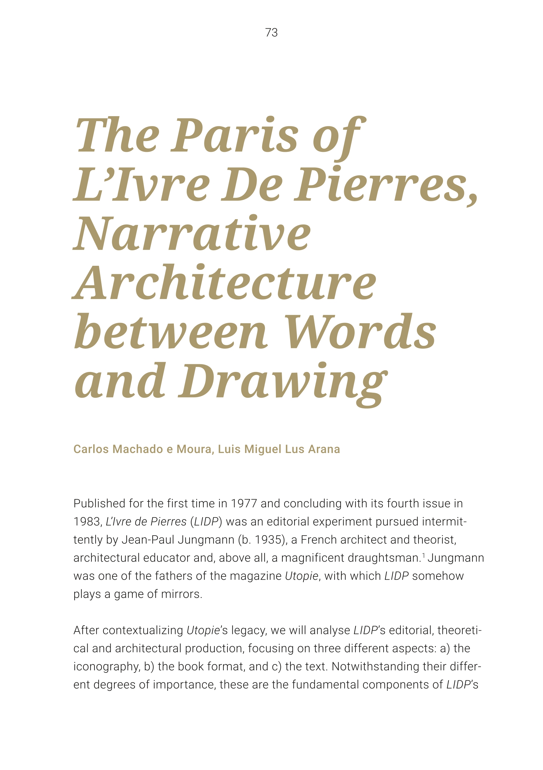 Resumen: An editorial experiment pursued by Jean-Paul Jungmann between 1977 and 1983, L’Ivre de Pierres provides a series of imaginary visions, mostly of an imaginary Paris, conceived through architectural narrations that were articulated in the pages of a book. This article examines L’Ivre de Pierres’ unconventional approach to figurative writing, as an example of the possibilities of exploring architecture through narrative means, constructing urban narratives through architectural design, and developing architectural criticism through both. L’Ivre de Pierres did not renounce the project in favour of discourse, but employed architectural devices to elaborate a ‘concrete utopia’ instead: one made of potentially realizable projects which, however, were conceived to exist only as (real) fictions in the pages of a book. Firmly rooted in Jungmann’s previous experience with the magazine Utopie, with which it somehow plays a game of mirrors, L’Ivre de Pierres is also linked to the tradition of paper architecture that historically used fiction to produce architectural discourses, criticism, or to think architectural designs. This article researches on the narrative methods and modes – it examines the iconography, the book format, the content and types of texts – used in L’Ivre de Pierres as an example of the potential that these both visual and textual alternative realities have for the reading, thinking and writing of urban places. Idioma: Inglés DOI: 10.7480/writingplace.5.5874 Año: 2021 Publicado en: Writingplace 5 (2021), 73-97 ISSN: 2589-7683 Tipo y forma: Artículo (Versión definitiva) Área (Departamento): Área Composición Arquitectónic (Dpto. Arquitectura)