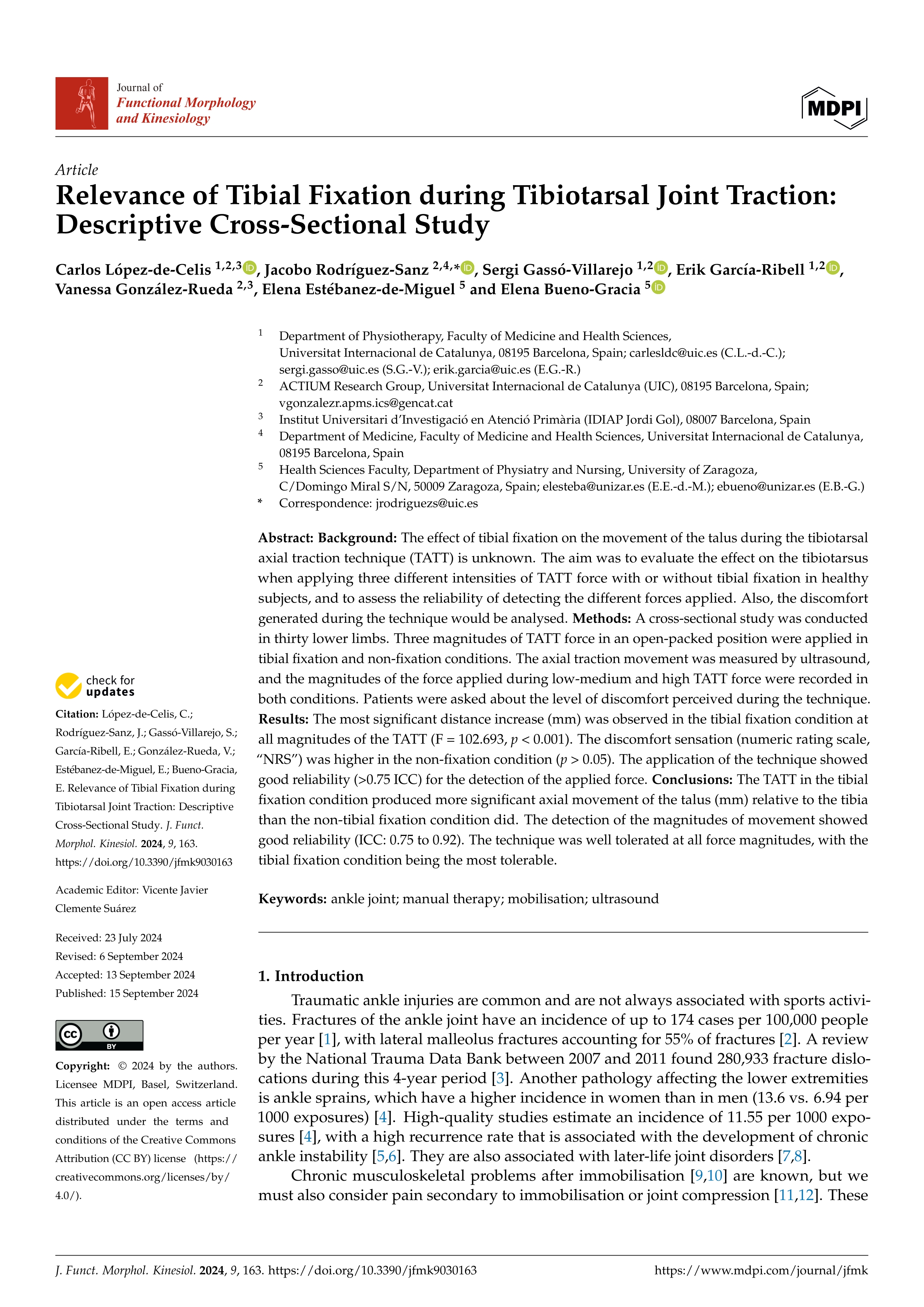 Resumen: Background: The effect of tibial fixation on the movement of the talus during the tibiotarsal axial traction technique (TATT) is unknown. The aim was to evaluate the effect on the tibiotarsus when applying three different intensities of TATT force with or without tibial fixation in healthy subjects, and to assess the reliability of detecting the different forces applied. Also, the discomfort generated during the technique would be analysed. Methods: A cross-sectional study was conducted in thirty lower limbs. Three magnitudes of TATT force in an open-packed position were applied in tibial fixation and non-fixation conditions. The axial traction movement was measured by ultrasound, and the magnitudes of the force applied during low-medium and high TATT force were recorded in both conditions. Patients were asked about the level of discomfort perceived during the technique. Results: The most significant distance increase (mm) was observed in the tibial fixation condition at all magnitudes of the TATT (F = 102.693, p < 0.001). The discomfort sensation (numeric rating scale, “NRS”) was higher in the non-fixation condition (p > 0.05). The application of the technique showed good reliability (>0.75 ICC) for the detection of the applied force. Conclusions: The TATT in the tibial fixation condition produced more significant axial movement of the talus (mm) relative to the tibia than the non-tibial fixation condition did. The detection of the magnitudes of movement showed good reliability (ICC: 0.75 to 0.92). The technique was well tolerated at all force magnitudes, with the tibial fixation condition being the most tolerable. Idioma: Inglés DOI: 10.3390/jfmk9030163 Año: 2024 Publicado en: Journal of Functional Morphology and Kinesiology 9, 3 (2024), 163 [12 pp.] ISSN: 2411-5142 Factor impacto CITESCORE: 3.7 - Physical Therapy, Sports Therapy and Rehabilitation (Q2) - Orthopedics and Sports Medicine (Q2) - Anatomy (Q2) - Histology (Q3) - Rheumatology (Q2)
