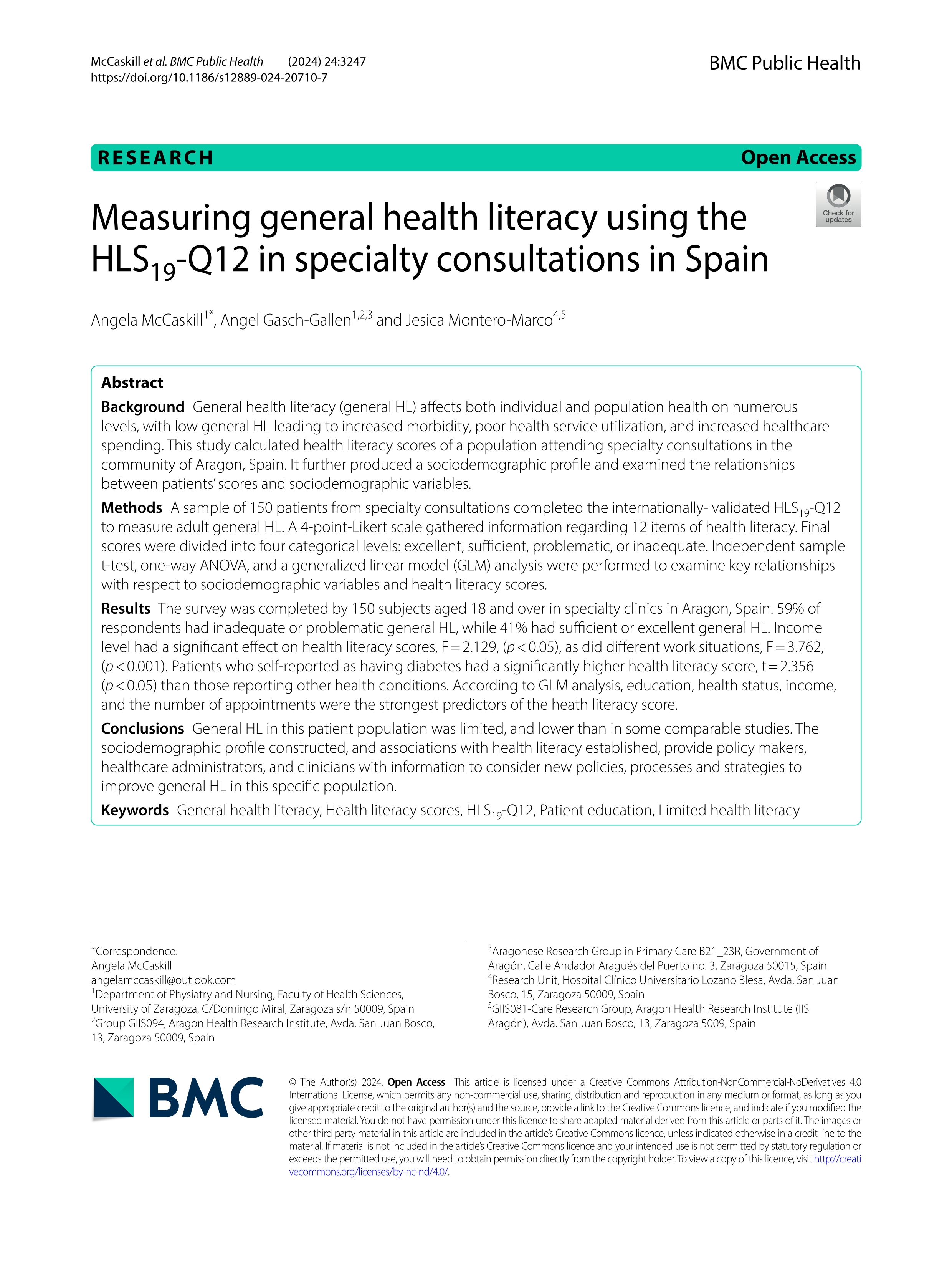 General HL in this patient population was limited, and lower than in some comparable studies. The sociodemographic profile constructed, and associations with health literacy established, provide policy makers, healthcare administrators, and clinicians with information to consider new policies, processes and strategies to improve general HL in this specific population. Idioma: Inglés DOI: 10.1186/s12889-024-20710-7 Año: 2024 Publicado en: BMC PUBLIC HEALTH 24, 1 (2024), 10 pp. ISSN: 1471-2458 Factor impacto JCR: 3.6 (2024) Categ. JCR: PUBLIC, ENVIRONMENTAL & OCCUPATIONAL HEALTH rank: 73 / 419 = 0.174 (2024) - Q1 - T1 Factor impacto CITESCORE: 6.0 - Public Health, Environmental and Occupational Health (Q1)