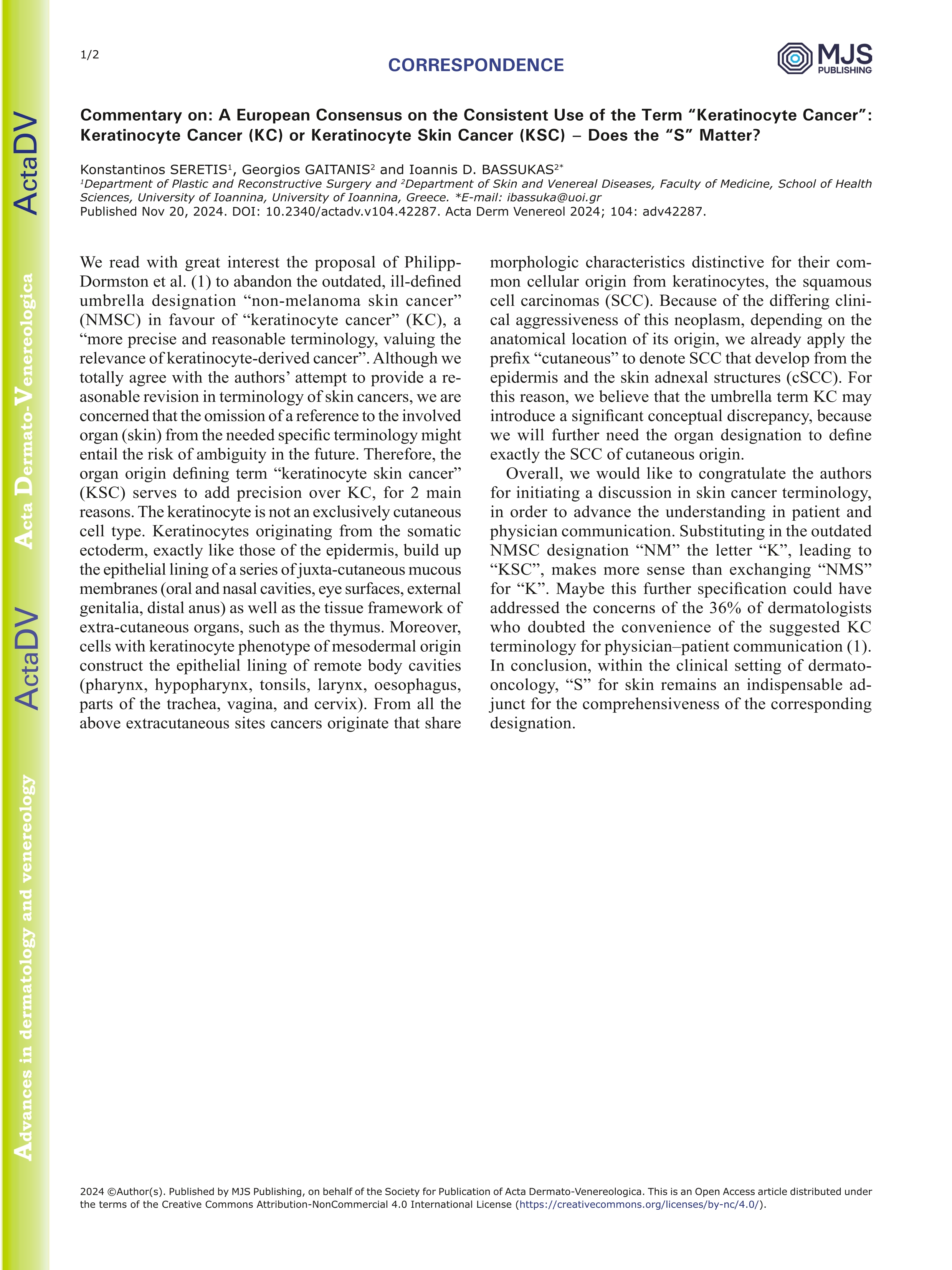 | Página principal > Artículos > Reply to “Commentary on: A European Consensus on the Consistent Use of the Term “Keratinocyte Cancer”: Keratinocyte Cancer (KC) or Keratinocyte Skin Cancer (KSC) – Does the “S” Matter? |