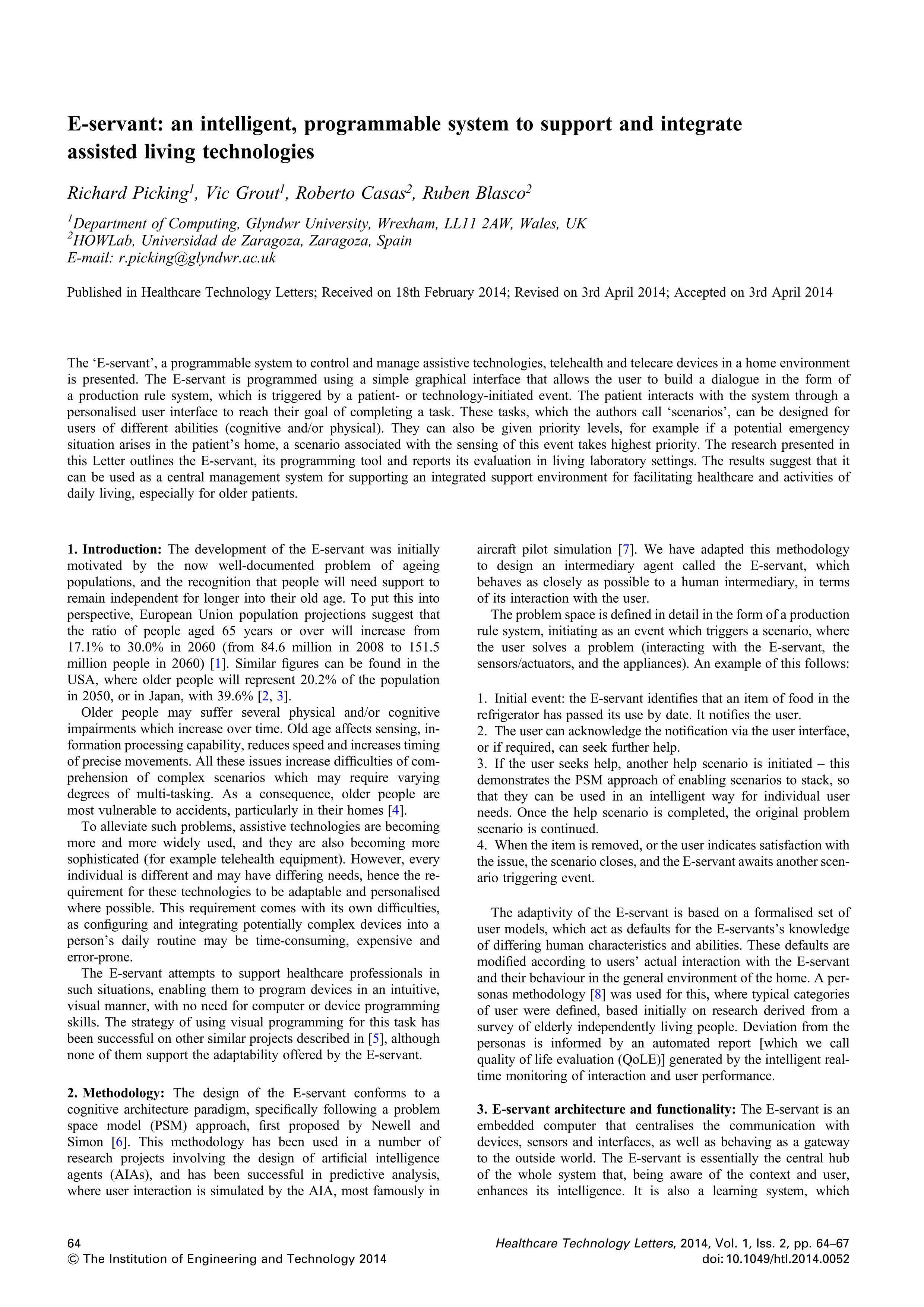 Resumen: The ‘E-servant’, a programmable system to control and manage assistive technologies, telehealth and telecare devices in a home environment is presented. The E-servant is programmed using a simple graphical interface that allows the user to build a dialogue in the form of a production rule system, which is triggered by a patient- or technology-initiated event. The patient interacts with the system through a personalised user interface to reach their goal of completing a task. These tasks, which the authors call ‘scenarios’, can be designed for users of different abilities (cognitive and/or physical). They can also be given priority levels, for example if a potential emergency situation arises in the patient's home, a scenario associated with the sensing of this event takes highest priority. The research presented in this Letter outlines the E-servant, its programming tool and reports its evaluation in living laboratory settings. The results suggest that it can be used as a central management system for supporting an integrated support environment for facilitating healthcare and activities of daily living, especially for older patients. Idioma: Inglés DOI: 10.1049/htl.2014.0052 Año: 2014 Publicado en: Healthcare Technology Letters 1, 2 (2014), 64-67 ISSN: 2053-3713 Financiación: info:eu-repo/grantAgreement/EUR/FP6/IST-045515 Tipo y forma: Artículo (Versión definitiva) Área (Departamento): Área Tecnología Electrónica (Dpto. Ingeniería Electrón.Com.)