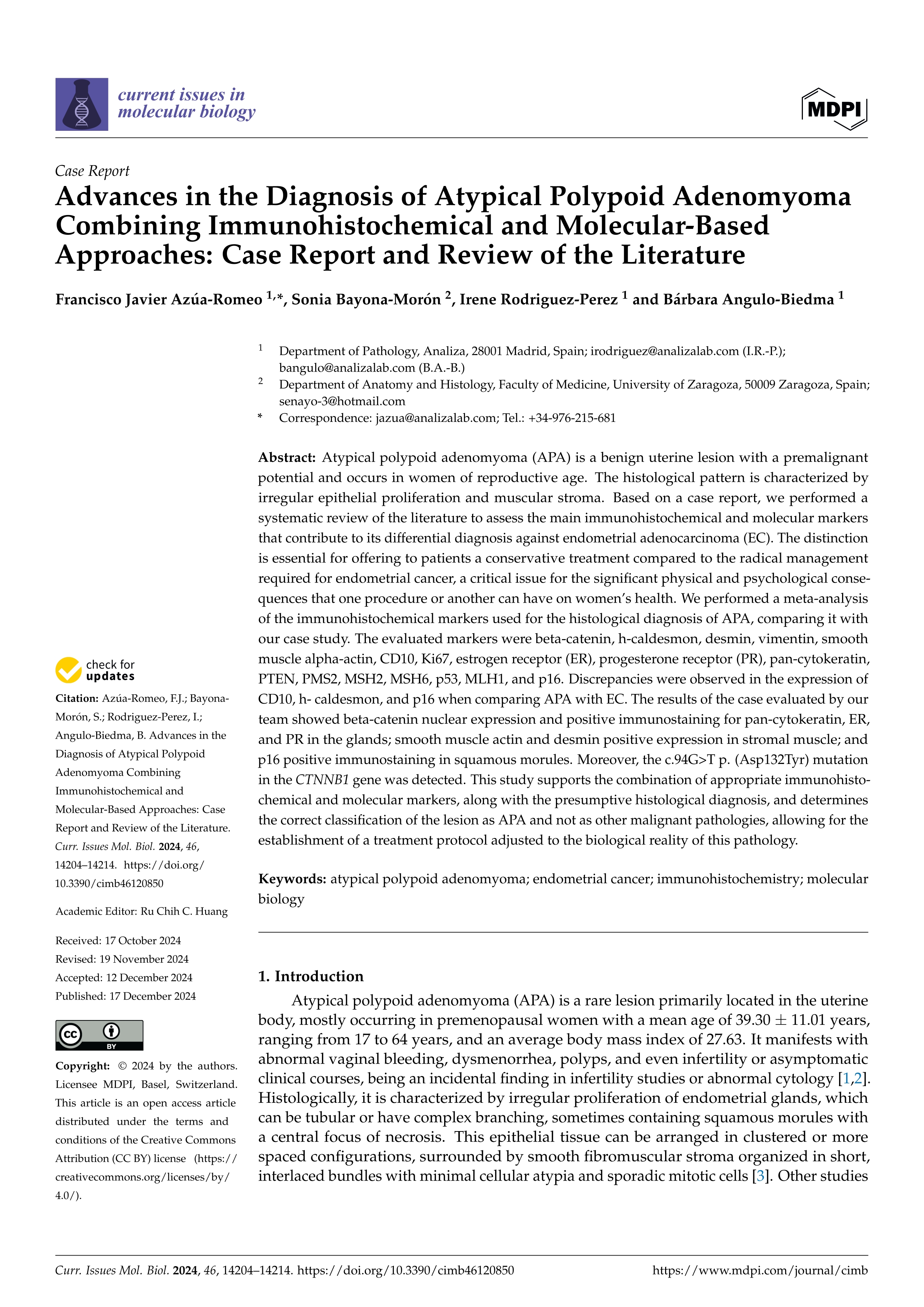 | Accueil > articulos > Advances in the diagnosis of atypical polypoid adenomyoma combining immunohistochemical and molecular-based approaches: case report and review of the literature |