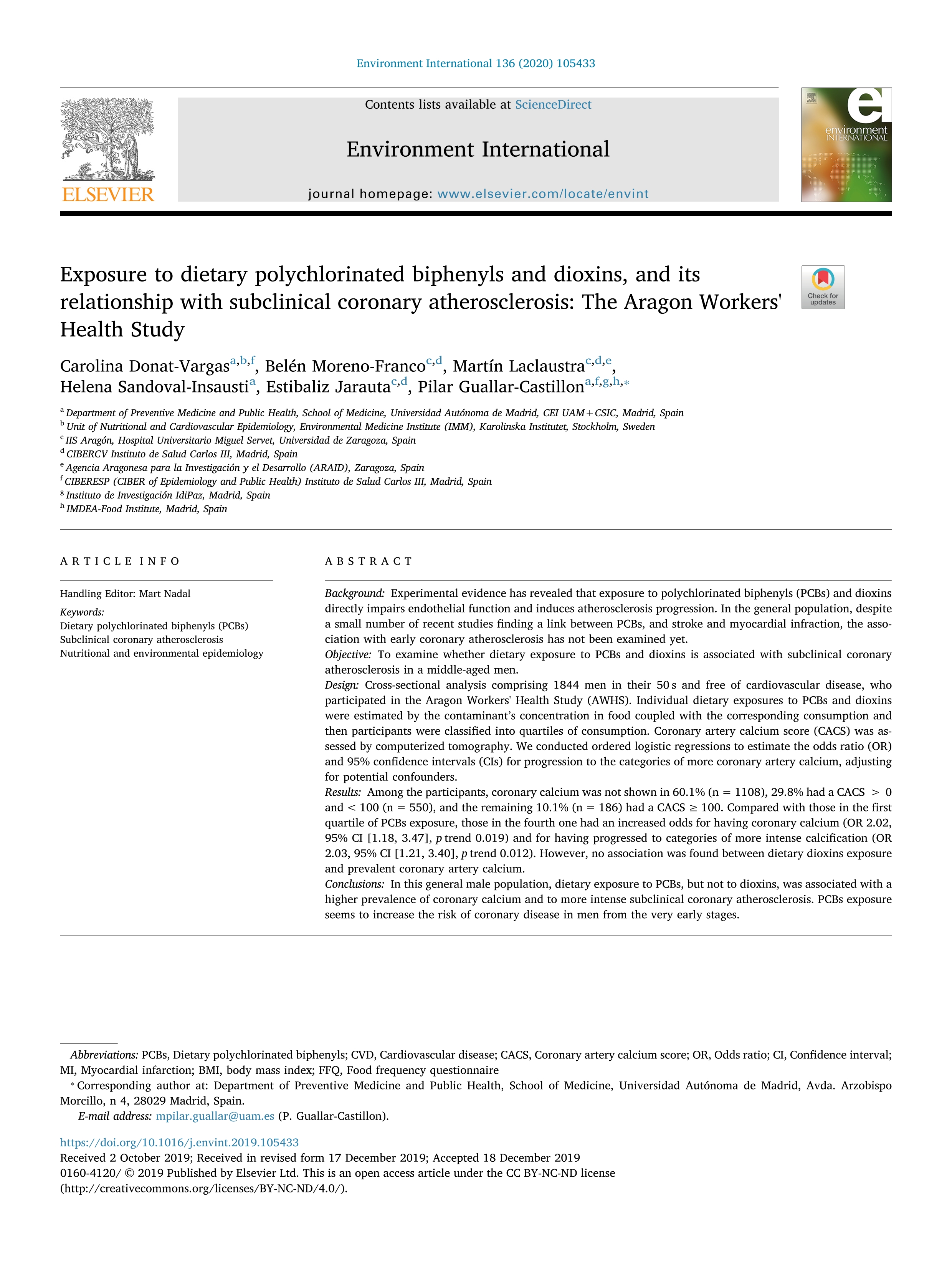 | Página principal > Artículos > Exposure to dietary polychlorinated biphenyls and dioxins, and its relationship with subclinical coronary atherosclerosis: The Aragon Workers' Health Study |