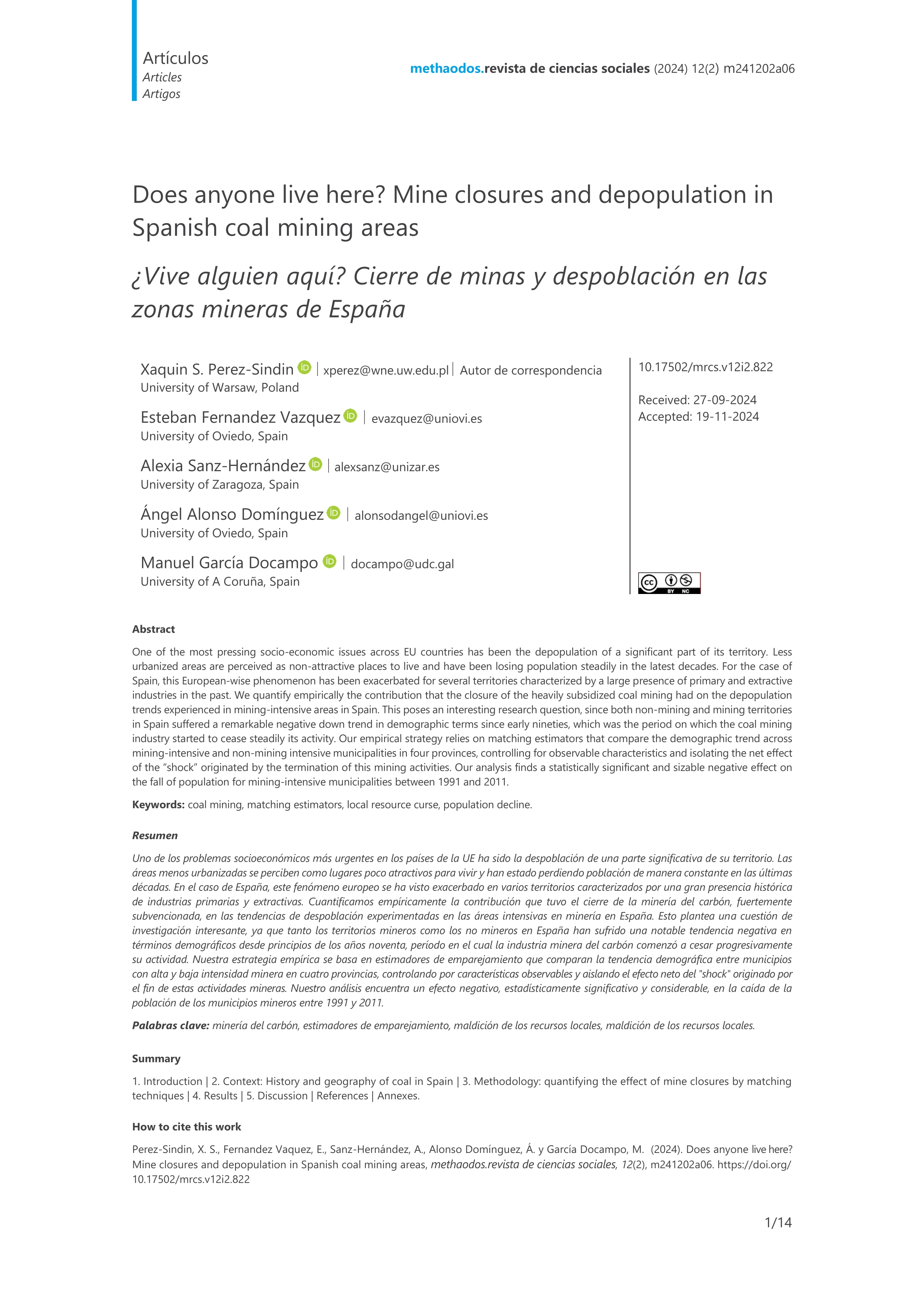 Resumen: One of the most pressing socio-economic issues across EU countries has been the depopulation of a significant part of its territory. Less urbanized areas are perceived as non-attractive places to live and have been losing population steadily in the latest decades. For the case of Spain, this European-wise phenomenon has been exacerbated for several territories characterized by a large presence of primary and extractive industries in the past. We quantify empirically the contribution that the closure of the heavily subsidized coal mining had on the depopulation trends experienced in mining-intensive areas in Spain. This poses an interesting research question, since both non-mining and mining territories in Spain suffered a remarkable negative down trend in demographic terms since early nineties, which was the period on which the coal mining industry started to cease steadily its activity. Our empirical strategy relies on matching estimators that compare the demographic trend across mining-intensive and non-mining intensive municipalities in four provinces, controlling for observable characteristics and isolating the net effect of the “shock” originated by the termination of this mining activities. Our analysis finds a statistically significant and sizable negative effect on the fall of population for mining-intensive municipalities between 1991 and 2011. Idioma: Inglés DOI: 10.17502/mrcs.v12i2.822 Año: 2024 Publicado en: Methaodos. revista de ciencias sociales 12, 2 (2024), m241202a06 [14 pp.] ISSN: 2340-8413 Financiación: info:eu-repo/grantAgreement/ES/AEI/PID2020-114211RB-100 Tipo y forma: Artículo (Versión definitiva) Área (Departamento): Área Sociología (Dpto. Psicología y Sociología)