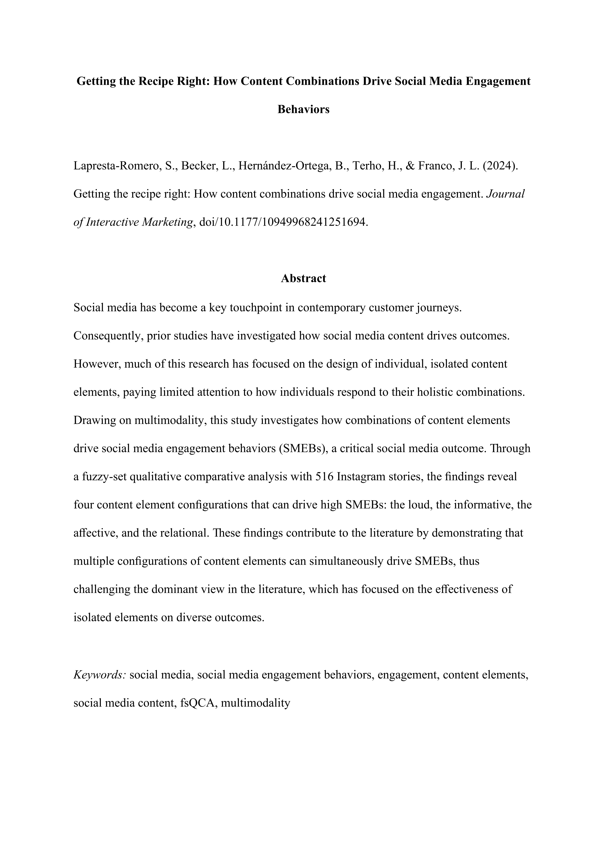 Resumen: Social media has become a key touchpoint in contemporary customer journeys. Consequently, prior studies have investigated how social media content drives outcomes. However, much of this research has focused on the design of individual, isolated content elements, paying limited attention to how individuals respond to their holistic combinations. Drawing on multimodality, this study investigates how combinations of content elements drive social media engagement behaviors (SMEBs), a critical social media outcome. Through a fuzzy-set qualitative comparative analysis with 516 Instagram stories, the findings reveal four content element configurations that can drive high SMEBs: the loud, the informative, the affective, and the relational. These findings contribute to the literature by demonstrating that multiple configurations of content elements can simultaneously drive SMEBs, thus challenging the dominant view in the literature, which has focused on the effectiveness of isolated elements on diverse outcomes.