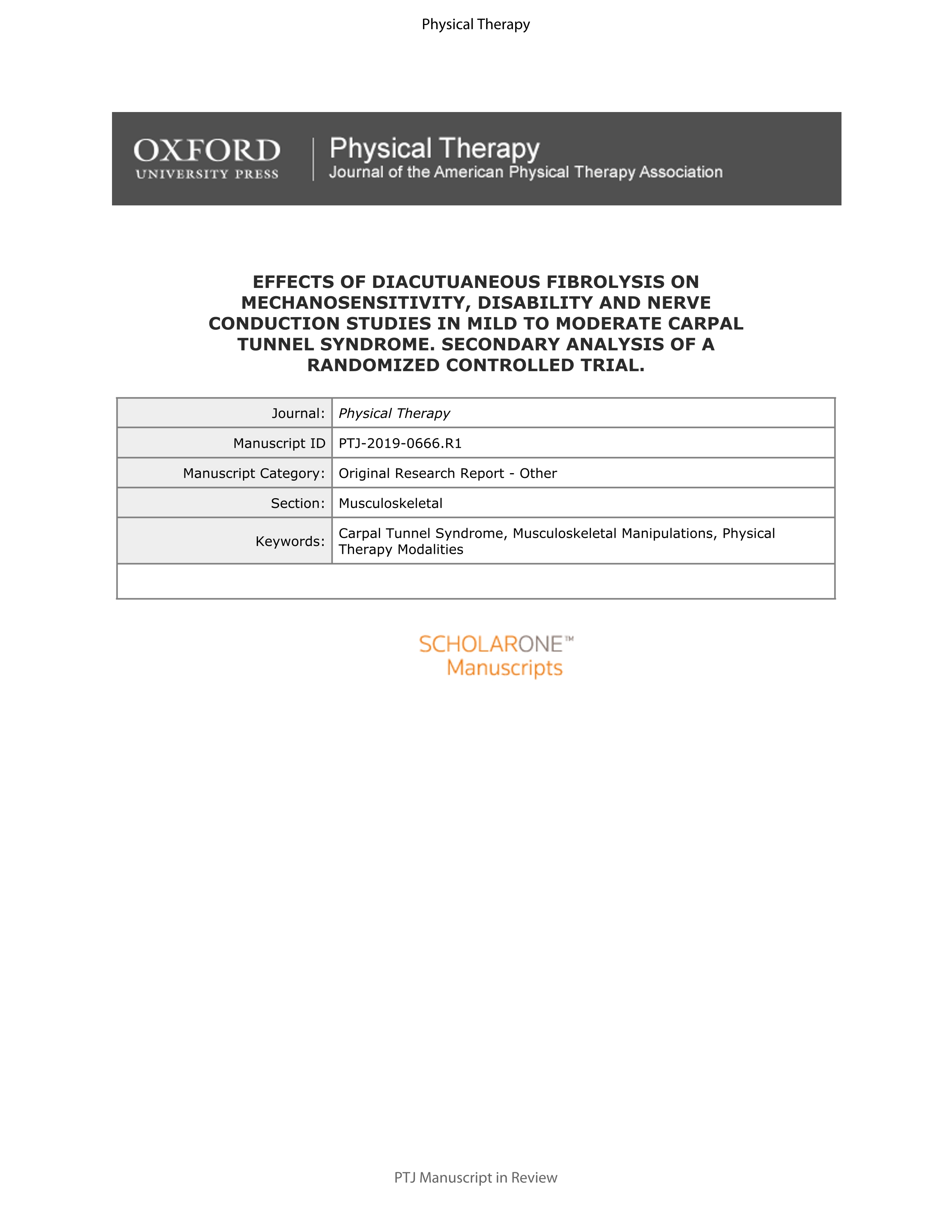 Página principal > Artículos > Effects of Diacutaneous Fibrolysis on Mechanosensitivity, Disability, and Nerve Conduction Studies in Mild to Moderate Carpal Tunnel Syndrome: Secondary Analysis of a Randomized Controlled Trial