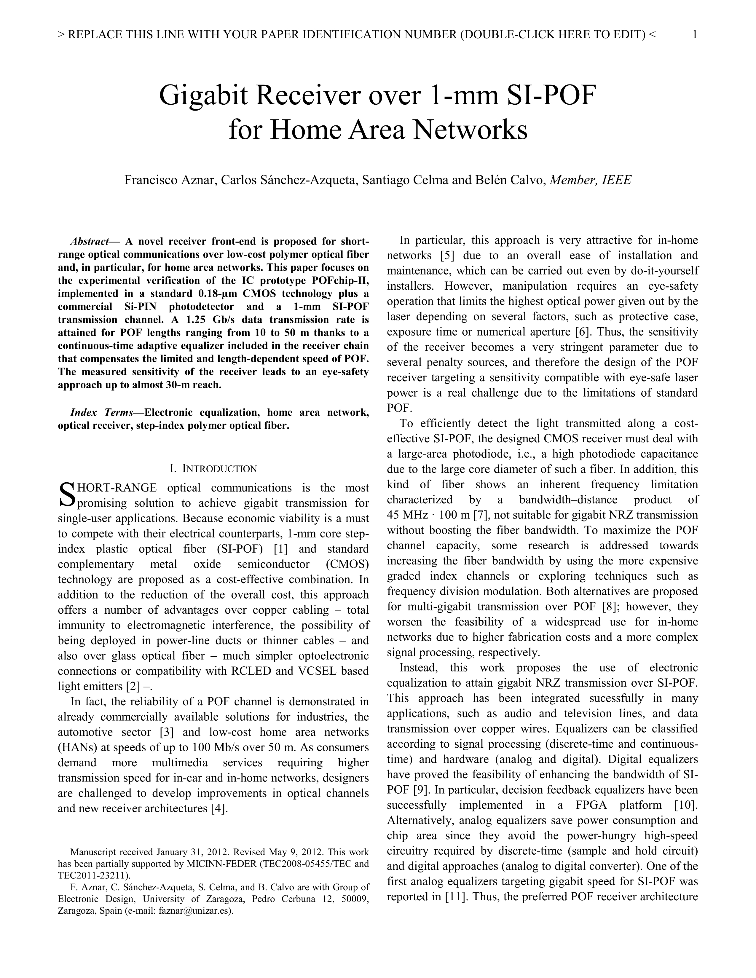 Resumen: A novel receiver front-end is proposed for short-range optical communications over low-cost polymer optical fiber and, in particular, for home area networks. This paper focuses on the experimental verification of the IC prototype POFchip-II, implemented in a standard 0.18- μ m CMOS technology plus a commercial Si-PIN photodetector and a 1 mm step-index plastic optical fiber (POF) transmission channel. A 1.25 Gb/s data transmission rate is attained for POF lengths ranging from 10 to 50 m thanks to a continuous-time adaptive equalizer included in the receiver chain that compensates the limited and length-dependent speed of POF. The measured sensitivity of the receiver leads to an eye-safety approach up to almost 30 m reach. Idioma: Inglés DOI: 10.1109/JLT.2012.2205220 Año: 2012 Publicado en: Journal of Lightwave Technology 30, 16 (2012), 2668-2674 ISSN: 0733-8724 Factor impacto JCR: 2.555 (2012) Categ. JCR: ENGINEERING, ELECTRICAL & ELECTRONIC rank: 32 / 243 = 0.132 (2012) - Q1 - T1 Categ. JCR: TELECOMMUNICATIONS rank: 6 / 76 = 0.079 (2012) - Q1 - T1 Categ. JCR: OPTICS rank: 11 / 80 = 0.138 (2012) - Q1 - T1 Financiación: info:eu-repo/grantAgreement/ES/MICINN-FEDER/TEC2008-05455/TEC Financiación: info:eu-repo/grantAgreement/ES/MICINN-FEDER/TEC2011-23211 Tipo y forma: Artículo (PostPrint) Área (Departamento): Proy. investigación HCA (Dpto. Física Teórica) Área (Departamento): Área Electrónica (Dpto. Ingeniería Electrón.Com.)