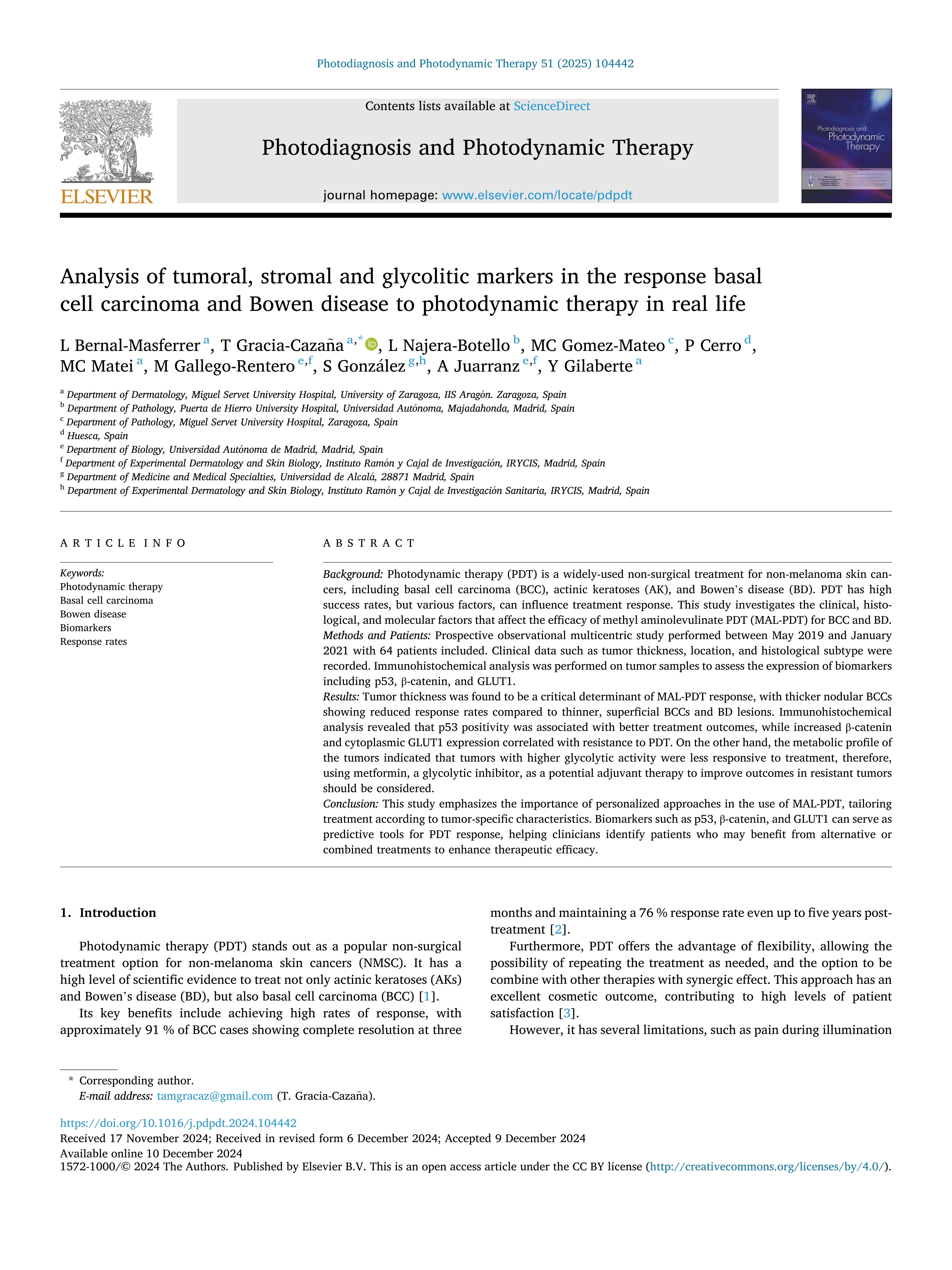 | Página principal > Artículos > Analysis of tumoral, stromal and glycolitic markers in the response basal cell carcinoma and Bowen disease to photodynamic therapy in real life |
