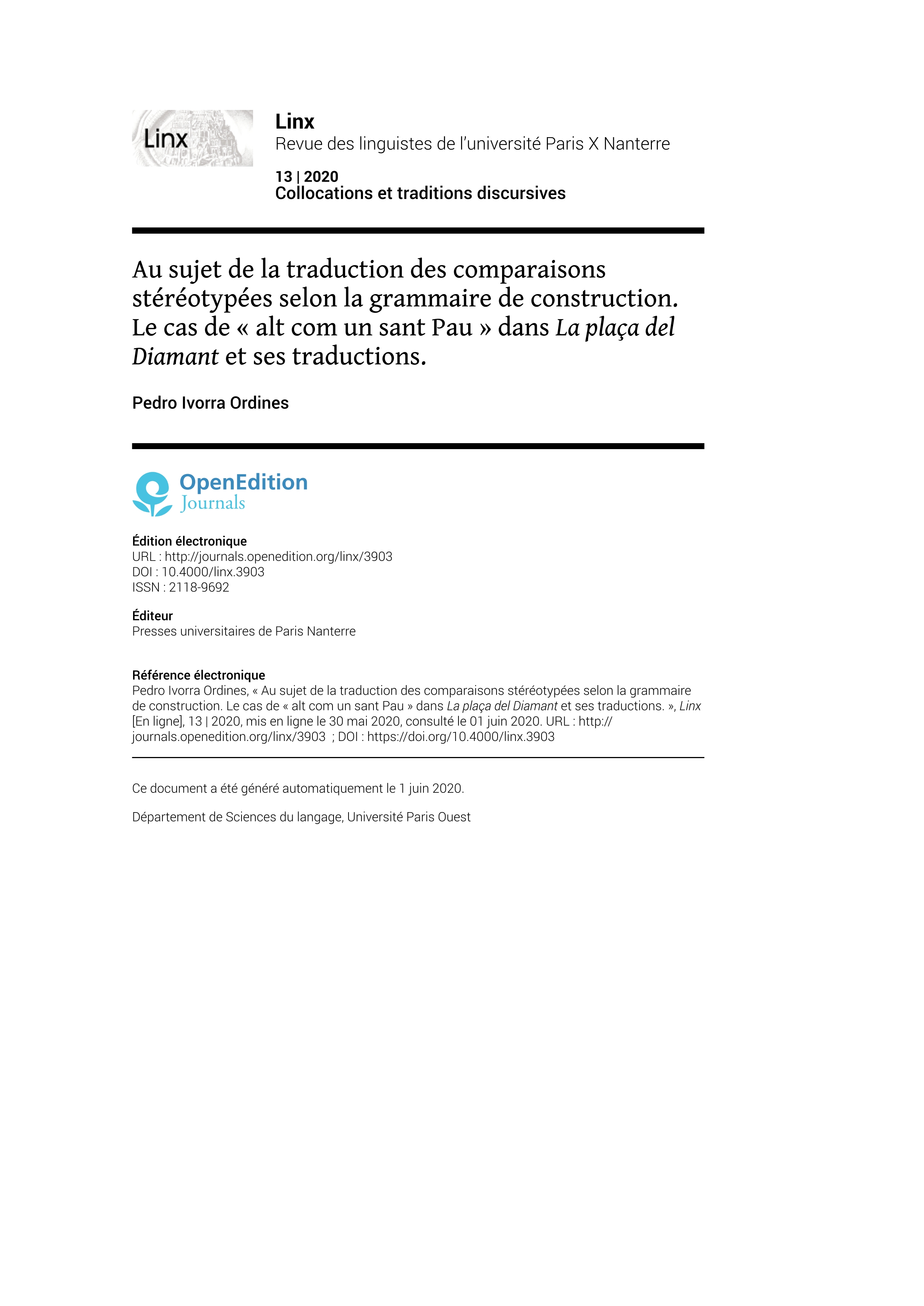 | Página principal > Artículos > Au sujet de la traduction des comparaisons stéréotypées selon la grammaire de construction. Le cas de « alt com un sant Pau » dans La plaça del Diamant et ses traductions. |