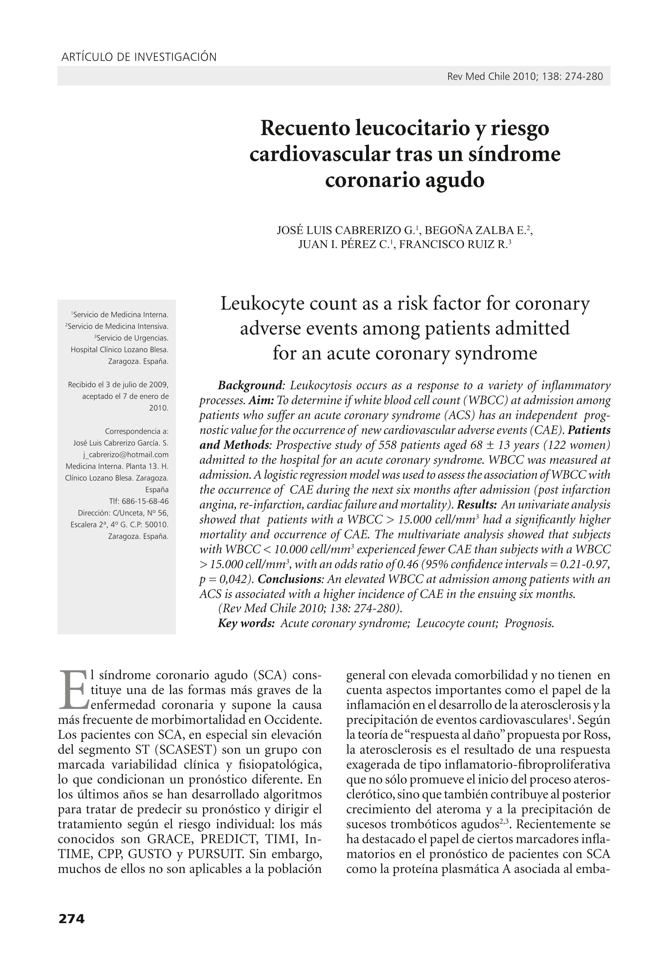 Recuento leucocitario y riesgo cardiovascular tras un síndrome coronario agudo