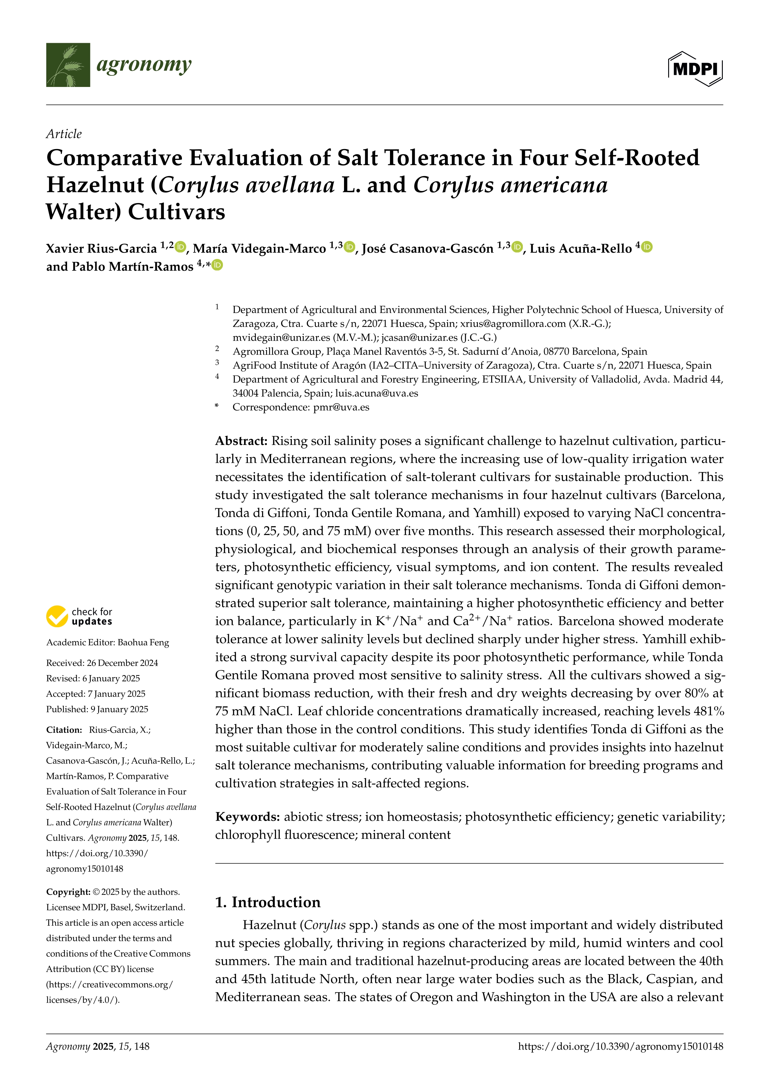Comparative Evaluation of Salt Tolerance in Four Self-Rooted Hazelnut (Corylus avellana L. and Corylus americana Walter) Cultivars