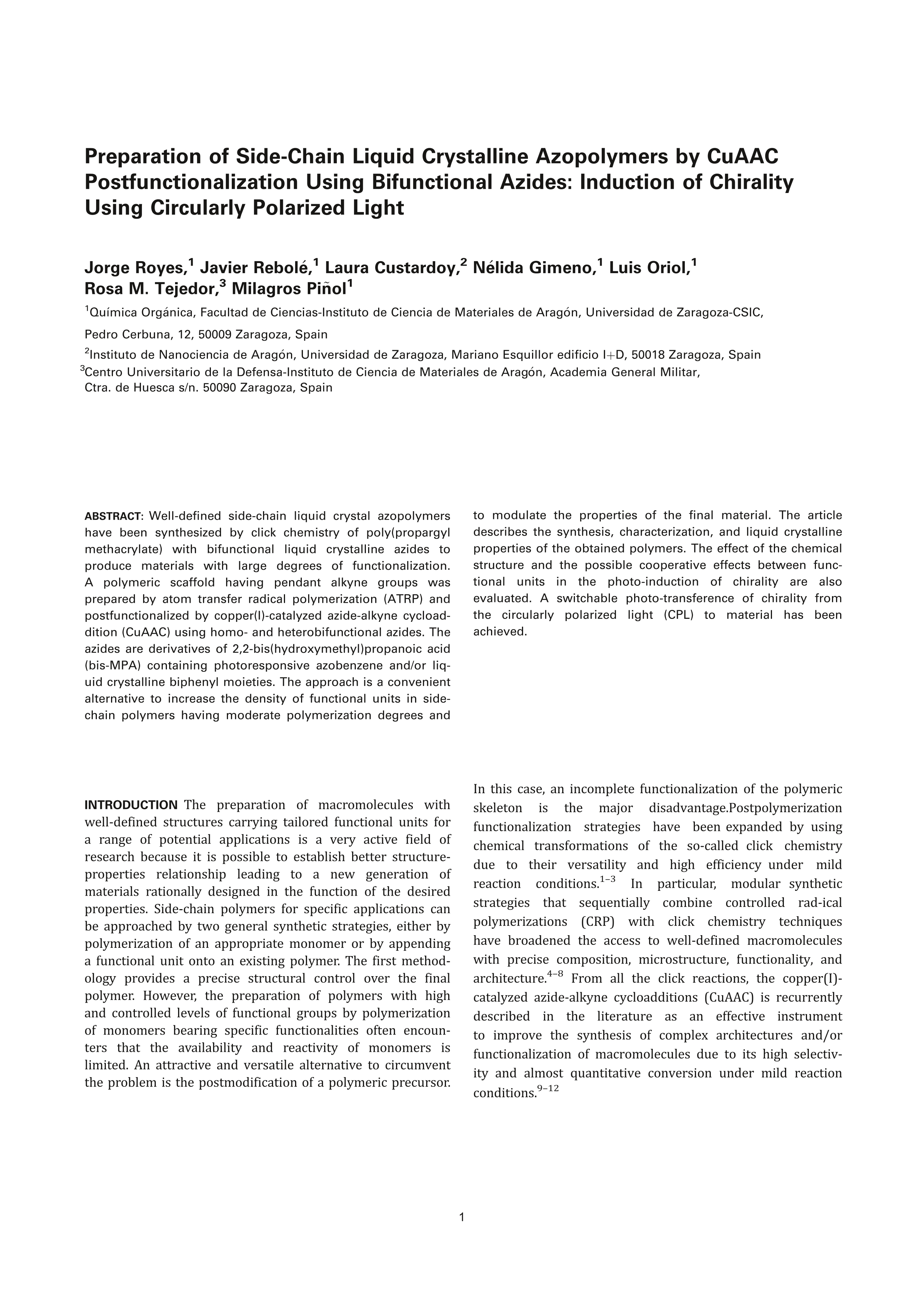 | Página principal > Artículos > Preparation of side-chain liquid crystalline Azopolymers by CuAAC postfunctionalization using bifunctional azides: Induction of chirality using circularly polarized light |